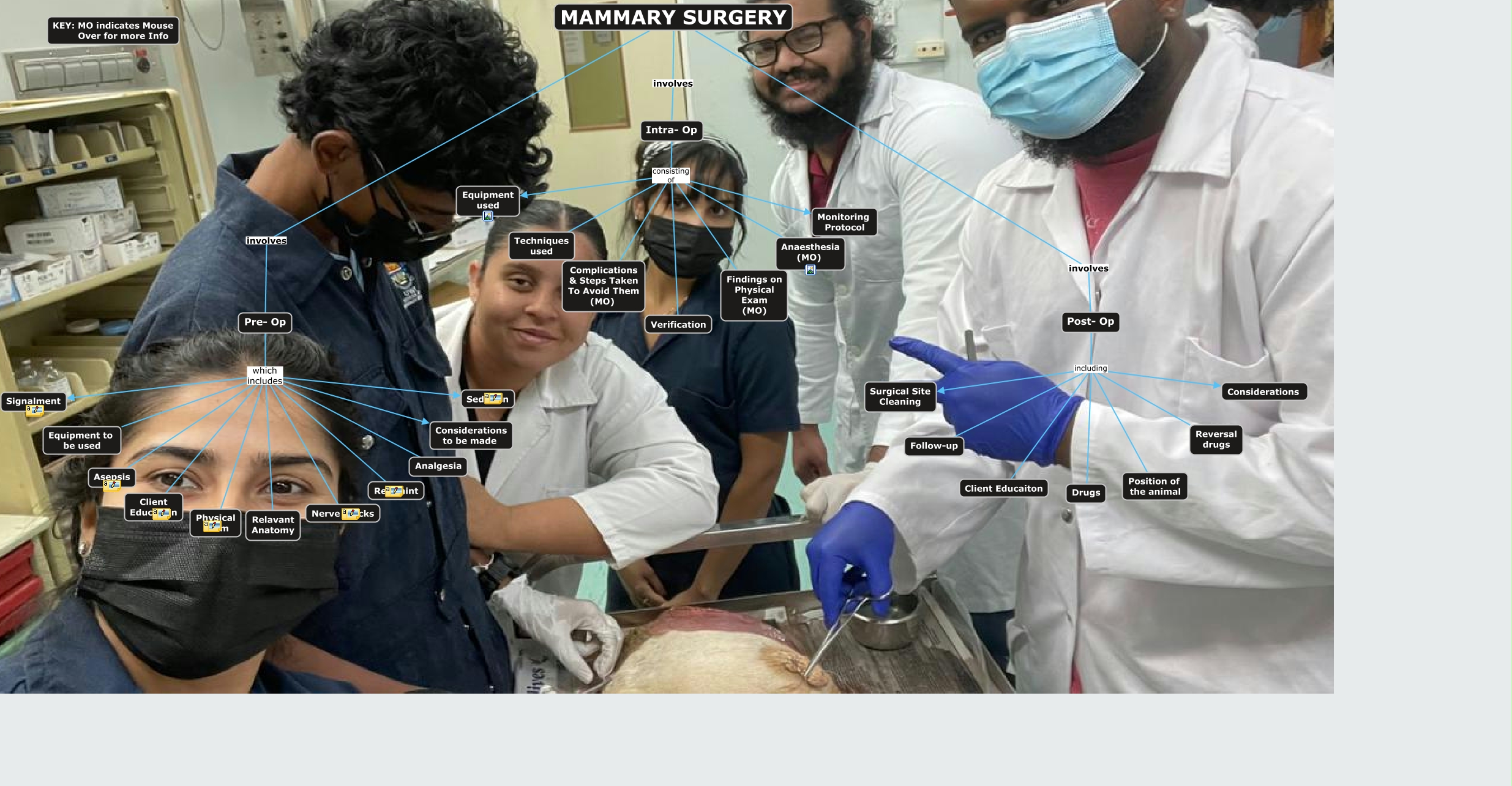 This Concept Map, created with IHMC CmapTools, has information related to: MMMARY SURGERY CMAP LAB 9, Pre- Op which includes Considerations to be made, Intra- Op consisting of Findings on Physical Exam (MO), Pre- Op which includes Nerve Blocks, Post- Op including Surgical Site Cleaning, Post- Op including Drugs, Intra- Op consisting of Anaesthesia (MO), Pre- Op which includes Equipment to be used, Pre- Op which includes Physical Exam, Post- Op including Follow-up, Intra- Op consisting of Techniques used, Intra- Op consisting of Complications & Steps Taken To Avoid Them (MO), Post- Op including Reversal drugs, Pre- Op which includes Sedation, Post- Op including Considerations, Pre- Op which includes Signalment, Pre- Op which includes Analgesia, Pre- Op which includes Client Education, MAMMARY SURGERY involves Post- Op, Pre- Op which includes Relavant Anatomy, MAMMARY SURGERY involves Pre- Op