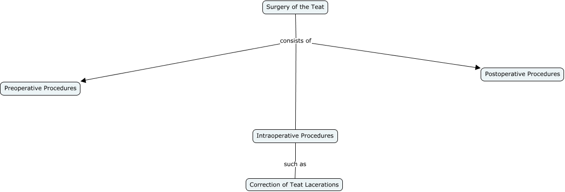 This Concept Map, created with IHMC CmapTools, has information related to: Mammary Gland, Intraoperative Procedures such as Correction of Teat Lacerations, Surgery of the Teat consists of Preoperative Procedures, Surgery of the Teat consists of Postoperative Procedures, Surgery of the Teat consists of Intraoperative Procedures