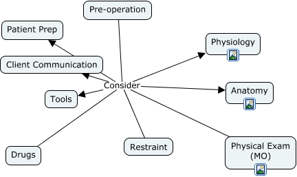 This Concept Map, created with IHMC CmapTools, has information related to: Pre-operation_2, Pre-operation Consider Anatomy, Pre-operation Consider Tools, Pre-operation Consider Patient Prep, Pre-operation Consider Restraint, Pre-operation Consider Drugs, Pre-operation Consider Physiology, Pre-operation Consider Physical Exam (MO), Pre-operation Consider Client Communication