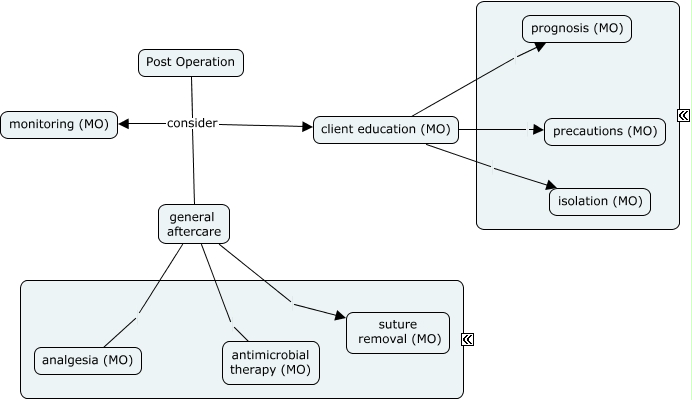 This Concept Map, created with IHMC CmapTools, has information related to: Post operation - backup, general aftercare analgesia (MO), Post Operation consider monitoring (MO), Post Operation consider general aftercare, client education (MO) prognosis (MO), Post Operation consider client education (MO), client education (MO) precautions (MO), general aftercare antimicrobial therapy (MO), general aftercare suture removal (MO), client education (MO) isolation (MO)
