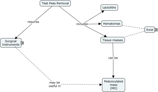This Concept Map, created with IHMC CmapTools, has information related to: Polyp Removal - backup, Surgical Instruments include Cornell teat curette (MO), Hematomas exist as Attached to teat wall, Surgical Instruments include Teat Splitter (MO), Tissue masses exist as Attached to teat wall, Teat Peas Removal includes Tissue masses, Tissue masses exist as Polyps, Hematomas exist as Free floating, Teat Peas Removal requires Surgical Instruments, Surgical Instruments include Hug's tumour remover (MO), Teat Splitter (MO) may be useful in Pedunculated mass (MO), Teat Peas Removal includes Lactoliths, Tissue masses exist as Free floating, Teat Peas Removal includes Hematomas, Hematomas exist as Polyps, Tissue masses can be Pedunculated mass (MO)