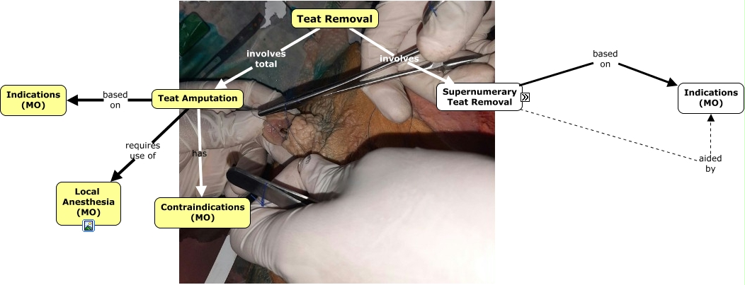This Concept Map, created with IHMC CmapTools, has information related to: Teat Removal, Supernummerary Teat Removal via Accessory Gland Sclerosis, Diagnosis (MO) aided by Indications (MO), Supernummerary Teat Removal via Teat Resection (MO), Teat Removal involves total Teat Amputation, Teat Amputation requires use of Local Anesthesia (MO), Teat Amputation based on Indications (MO), Teat Removal involves Supernummerary Teat Removal, Teat Amputation has Contraindications (MO), Supernummerary Teat Removal after Diagnosis (MO), Supernummerary Teat Removal based on Indications (MO), Supernummerary Teat Removal via Cistern Anastomosis (MO)
