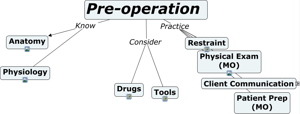 This Concept Map, created with IHMC CmapTools, has information related to: Pre-operation_5, Pre-operation Practice Restraint, Pre-operation Practice Client Communication, Pre-operation Consider Tools, Client Communication Discuss with client: 3. Post-op care (MO), Pre-operation Consider Drugs, Pre-operation Practice Patient Prep (MO), Client Communication Discuss with client: 5. Consent, Pre-operation Practice Restraint, Client Communication Discuss with client: 4. Cost associated (MO), Pre-operation Know Anatomy, Client Communication Discuss with client: 1. Treatment options (MO), Client Communication Discuss with client: 2. Post-op complications (MO), Pre-operation Know Physiology, Pre-operation Practice Physical Exam (MO)