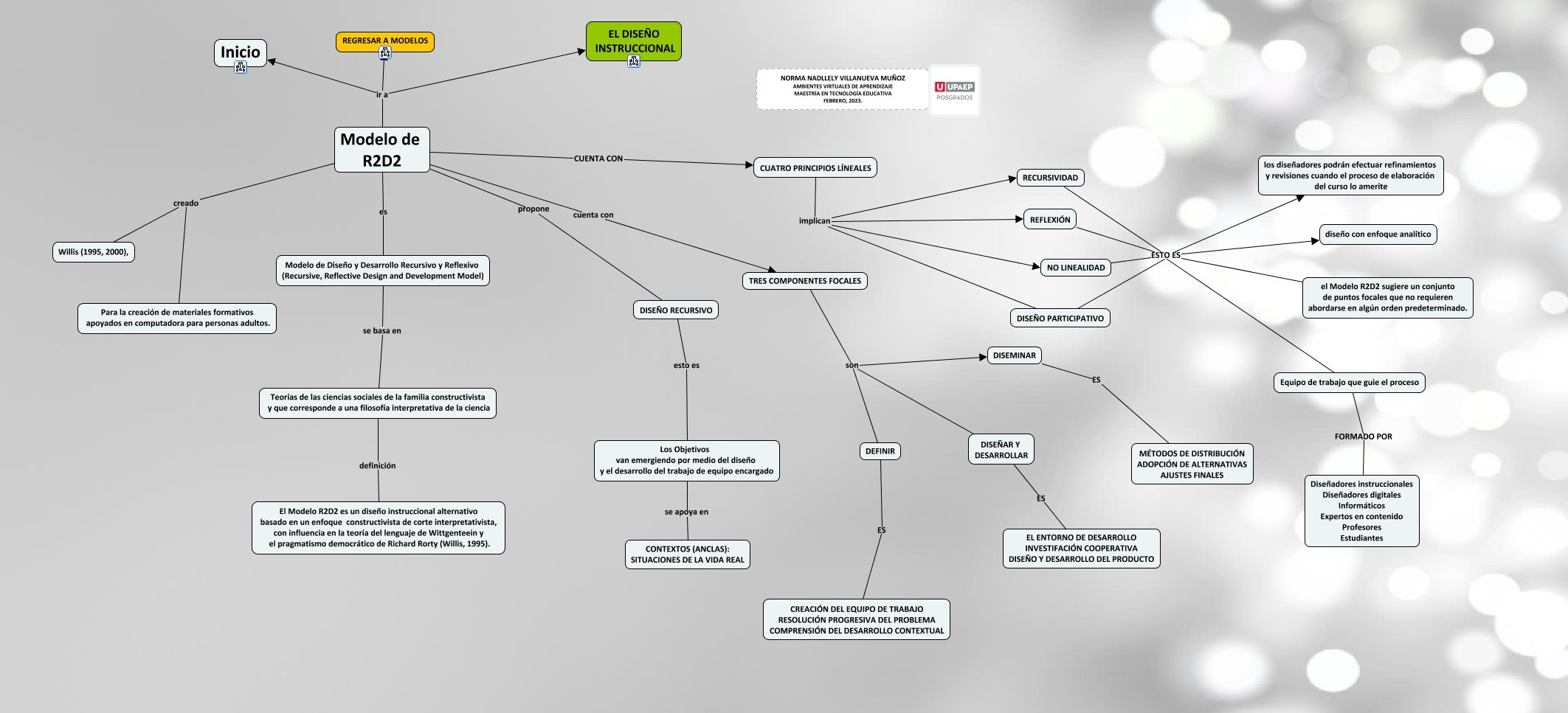 Este Cmap, tiene información relacionada con: 3.1.5 Modelo R2R2, CUATRO PRINCIPIOS LÍNEALES implican REFLEXIÓN, REFLEXIÓN ESTO ES los diseñadores podrán efectuar refinamientos y revisiones cuando el proceso de elaboración del curso lo amerite, Modelo de Diseño y Desarrollo Recursivo y Reflexivo (Recursive, Reflective Design and Development Model) se basa en Teorías de las ciencias sociales de la familia constructivista y que corresponde a una filosofía interpretativa de la ciencia, el Modelo R2D2 sugiere un conjunto de puntos focales que no requieren abordarse en algún orden predeterminado. ESTO ES los diseñadores podrán efectuar refinamientos y revisiones cuando el proceso de elaboración del curso lo amerite, REFLEXIÓN ESTO ES diseño con enfoque analítico, Modelo de R2D2 CUENTA CON CUATRO PRINCIPIOS LÍNEALES, Teorías de las ciencias sociales de la familia constructivista y que corresponde a una filosofía interpretativa de la ciencia definición El Modelo R2D2 es un diseño instruccional alternativo basado en un enfoque constructivista de corte interpretativista, con influencia en la teoría del lenguaje de Wittgenteein y el pragmatismo democrático de Richard Rorty (Willis, 1995)., Modelo de R2D2 ir a EL DISEÑO INSTRUCCIONAL, RECURSIVIDAD ESTO ES Equipo de trabajo que guie el proceso, TRES COMPONENTES FOCALES son DEFINIR, el Modelo R2D2 sugiere un conjunto de puntos focales que no requieren abordarse en algún orden predeterminado. ESTO ES Equipo de trabajo que guie el proceso, DEFINIR ES CREACIÓN DEL EQUIPO DE TRABAJO RESOLUCIÓN PROGRESIVA DEL PROBLEMA COMPRENSIÓN DEL DESARROLLO CONTEXTUAL, TRES COMPONENTES FOCALES son DISEÑAR Y DESARROLLAR, DISEÑO PARTICIPATIVO ESTO ES Equipo de trabajo que guie el proceso, RECURSIVIDAD ESTO ES los diseñadores podrán efectuar refinamientos y revisiones cuando el proceso de elaboración del curso lo amerite, el Modelo R2D2 sugiere un conjunto de puntos focales que no requieren abordarse en algún orden predeterminado. ESTO ES diseño con enfoque analítico, Equipo de trabajo que guie el proceso FORMADO POR Diseñadores instruccionales Diseñadores digitales Informáticos Expertos en contenido Profesores Estudiantes, Modelo de R2D2 ir a Inicio, NO LINEALIDAD ESTO ES Equipo de trabajo que guie el proceso, TRES COMPONENTES FOCALES son DISEMINAR