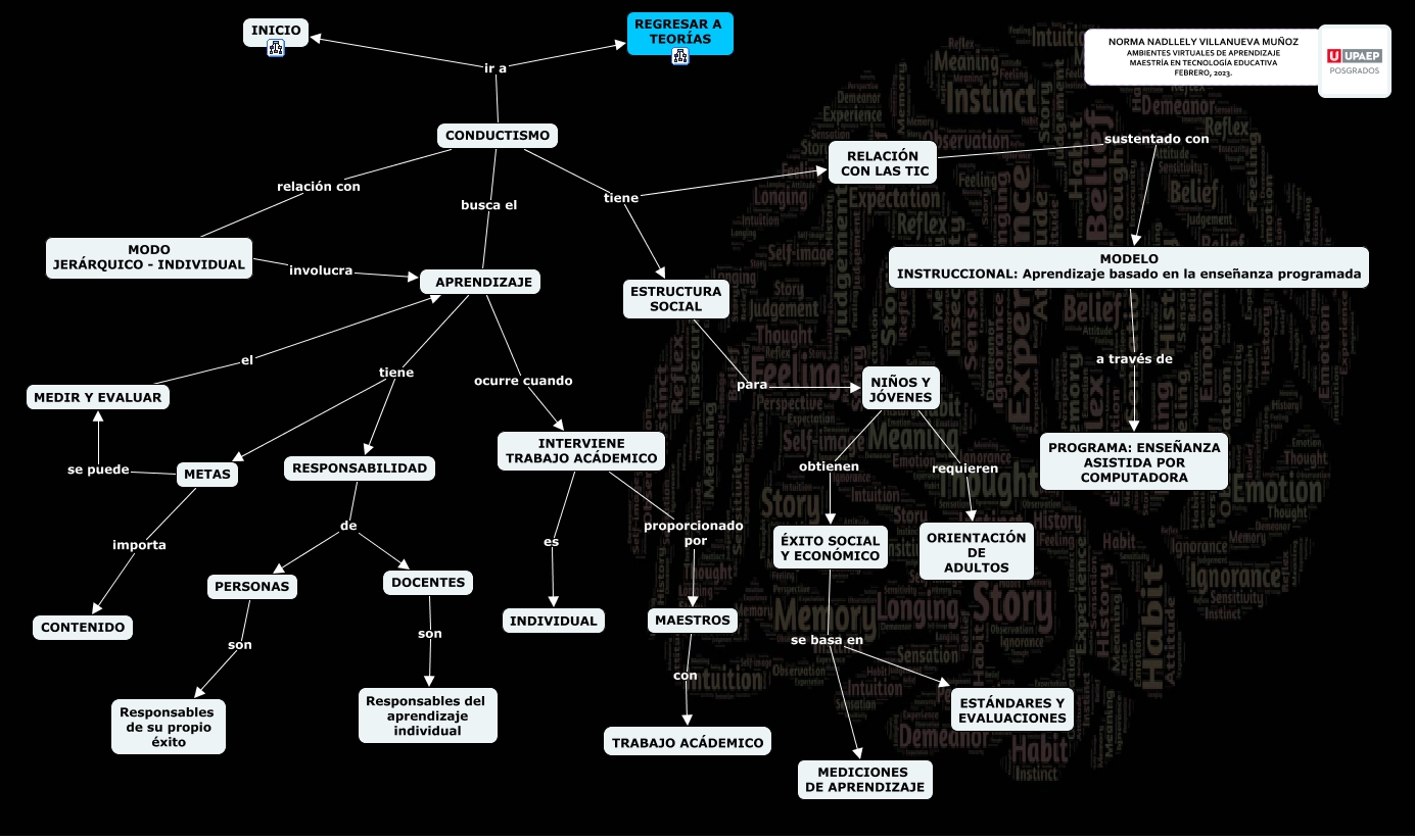Este Cmap, tiene información relacionada con: 2.1 CONDUCTISTA, CONDUCTISMO relación con MODO JERÁRQUICO - INDIVIDUAL, APRENDIZAJE tiene RESPONSABILIDAD, APRENDIZAJE ocurre cuando INTERVIENE TRABAJO ACÁDEMICO, METAS se puede MEDIR Y EVALUAR, RELACIÓN CON LAS TIC sustentado con MODELO INSTRUCCIONAL: Aprendizaje basado en la enseñanza programada, NIÑOS Y JÓVENES obtienen ÉXITO SOCIAL Y ECONÓMICO, MODELO INSTRUCCIONAL: Aprendizaje basado en la enseñanza programada a través de PROGRAMA: ENSEÑANZA ASISTIDA POR COMPUTADORA, APRENDIZAJE tiene METAS, CONDUCTISMO tiene ESTRUCTURA SOCIAL, ÉXITO SOCIAL Y ECONÓMICO se basa en ESTÁNDARES Y EVALUACIONES, MODO JERÁRQUICO - INDIVIDUAL involucra APRENDIZAJE, PERSONAS son Responsables de su propio éxito, ÉXITO SOCIAL Y ECONÓMICO se basa en MEDICIONES DE APRENDIZAJE, RESPONSABILIDAD de DOCENTES, INTERVIENE TRABAJO ACÁDEMICO es INDIVIDUAL, NIÑOS Y JÓVENES requieren ORIENTACIÓN DE ADULTOS, INTERVIENE TRABAJO ACÁDEMICO proporcionado por MAESTROS, METAS importa CONTENIDO, DOCENTES son Responsables del aprendizaje individual, ESTRUCTURA SOCIAL para NIÑOS Y JÓVENES