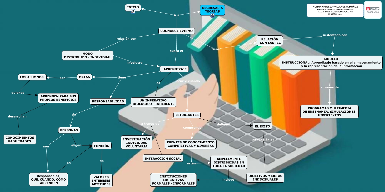 Este Cmap, tiene información relacionada con: 2.2 COGNITIVISTA, PERSONAS eligen FUNCIÓN, RELACIÓN CON LAS TIC sustentado con MODELO INSTRUCCIONAL: Aprendizaje basado en el almacenamiento y la representación de la información, APRENDIZAJE tiene RESPONSABILIDAD, RESPONSABILIDAD de PERSONAS, ESTUDIANTES comprenden FUENTES DE CONOCIMIENTO COMPETITIVAS Y DIVERSAS, LOS ALUMNOS quienes APRENDEN PARA SUS PROPIOS BENEFICIOS, ESTUDIANTES a través de INTERACCIÓN SOCIAL, AMPLIAMENTE DISTRIBUIDAS EN TODA LA SOCIEDAD incluye INSTITUCIONES EDUCATIVAS FORMALES - INFORMALES, PERSONAS son Responsables QUÉ, CUÁNDO, CÓMO APRENDEN, EL ÉXITO en función de OBJETIVOS Y METAS INDIVIDUALES, Responsables QUÉ, CUÁNDO, CÓMO APRENDEN en FUNCIÓN, COGNOSCITIVISMO ir a INICIO, APRENDIZAJE tiene METAS, FUNCIÓN de VALORES INTERESES APTITUDES, COGNOSCITIVISMO relación con MODO DISTRIBUIDO - INDIVIDUAL, FUENTES DE CONOCIMIENTO COMPETITIVAS Y DIVERSAS están AMPLIAMENTE DISTRIBUIDAS EN TODA LA SOCIEDAD, MODO DISTRIBUIDO - INDIVIDUAL involucra APRENDIZAJE, APRENDIZAJE ocurre cuando ESTUDIANTES, COGNOSCITIVISMO ir a REGRESAR A TEORÍAS, ESTUDIANTES a través de INVESTIGACIÓN INDIVIDUAL VOLUNTARIA