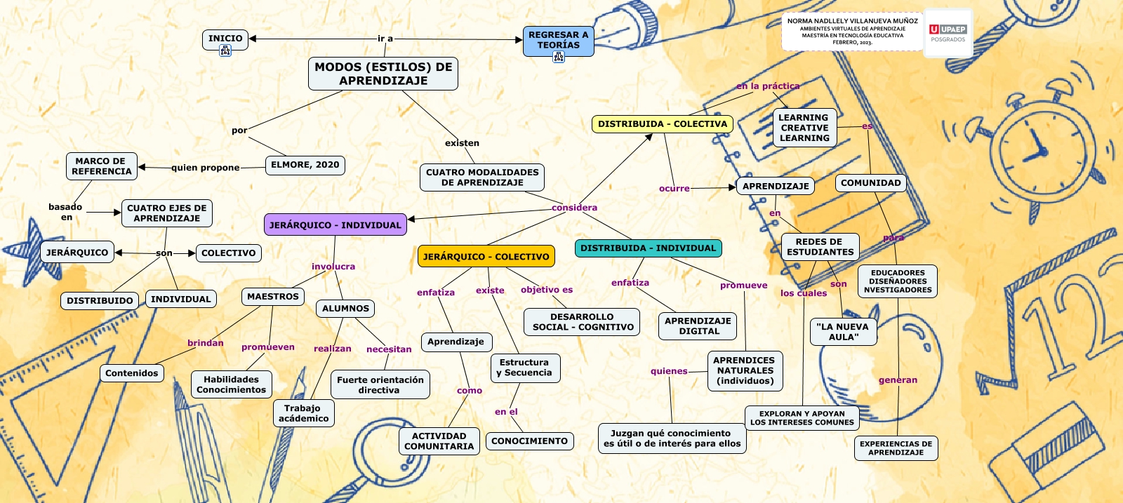 Este Cmap, tiene información relacionada con: 2.5 MODELOS DE APRENDIZAJE, JERÁRQUICO - COLECTIVO enfatiza Aprendizaje, JERÁRQUICO - COLECTIVO existe Estructura y Secuencia, CUATRO EJES DE APRENDIZAJE son INDIVIDUAL, JERÁRQUICO - INDIVIDUAL involucra ALUMNOS, REDES DE ESTUDIANTES los cuales EXPLORAN Y APOYAN LOS INTERESES COMUNES, REDES DE ESTUDIANTES son "LA NUEVA AULA", JERÁRQUICO - COLECTIVO objetivo es DESARROLLO SOCIAL - COGNITIVO, MODOS (ESTILOS) DE APRENDIZAJE por ELMORE, 2020, ELMORE, 2020 quien propone MARCO DE REFERENCIA, JERÁRQUICO - INDIVIDUAL involucra MAESTROS, MODOS (ESTILOS) DE APRENDIZAJE ir a INICIO, MAESTROS promueven Habilidades Conocimientos, ALUMNOS realizan Trabajo acádemico, Aprendizaje como ACTIVIDAD COMUNITARIA, DISTRIBUIDA - COLECTIVA en la práctica LEARNING CREATIVE LEARNING, CUATRO EJES DE APRENDIZAJE son JERÁRQUICO, COMUNIDAD para EDUCADORES DISEÑADORES NVESTIGADORES, ALUMNOS necesitan Fuerte orientación directiva, APRENDICES NATURALES (individuos) quienes Juzgan qué conocimiento es útil o de interés para ellos, CUATRO MODALIDADES DE APRENDIZAJE considera JERÁRQUICO - INDIVIDUAL