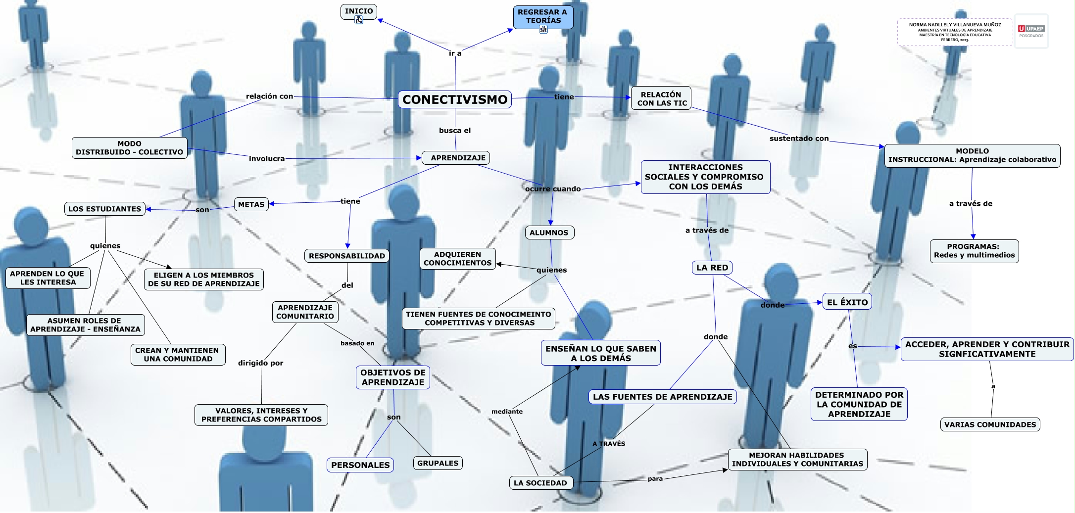 Este Cmap, tiene información relacionada con: 2.4 CONECTIVISTA, CONECTIVISMO ir a INICIO, MODO DISTRIBUIDO - COLECTIVO involucra APRENDIZAJE, APRENDIZAJE COMUNITARIO basado en OBJETIVOS DE APRENDIZAJE, LOS ESTUDIANTES quienes ELIGEN A LOS MIEMBROS DE SU RED DE APRENDIZAJE, EL ÉXITO es ACCEDER, APRENDER Y CONTRIBUIR SIGNFICATIVAMENTE, CONECTIVISMO ir a REGRESAR A TEORÍAS, RELACIÓN CON LAS TIC sustentado con MODELO INSTRUCCIONAL: Aprendizaje colaborativo, LOS ESTUDIANTES quienes ASUMEN ROLES DE APRENDIZAJE - ENSEÑANZA, APRENDIZAJE ocurre cuando INTERACCIONES SOCIALES Y COMPROMISO CON LOS DEMÁS, RESPONSABILIDAD del APRENDIZAJE COMUNITARIO, LA SOCIEDAD para MEJORAN HABILIDADES INDIVIDUALES Y COMUNITARIAS, OBJETIVOS DE APRENDIZAJE son PERSONALES, APRENDIZAJE ocurre cuando ALUMNOS, LOS ESTUDIANTES quienes CREAN Y MANTIENEN UNA COMUNIDAD, APRENDIZAJE tiene RESPONSABILIDAD, EL ÉXITO es DETERMINADO POR LA COMUNIDAD DE APRENDIZAJE, CONECTIVISMO tiene RELACIÓN CON LAS TIC, ALUMNOS quienes ADQUIEREN CONOCIMIENTOS, LA RED donde EL ÉXITO, LOS ESTUDIANTES quienes APRENDEN LO QUE LES INTERESA