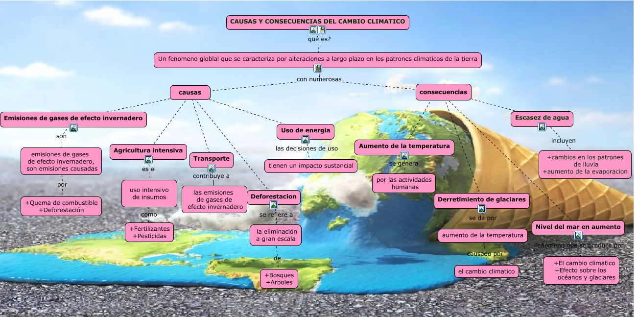 Este Cmap, tiene información relacionada con: mapa conceptual sobre las causas y consecuencias del cambio climatico, Uso de energia las decisiones de uso tienen un impacto sustancial, causas ???? Deforestacion, aumento de la temperatura causado por el cambio climatico, +Fertilizantes +Pesticidas como uso intensivo de insumos, consecuencias ???? Escasez de agua, Transporte contribuye a las emisiones de gases de efecto invernadero, Un fenomeno globlal que se caracteriza por alteraciones a largo plazo en los patrones climaticos de la tierra con numerosas consecuencias, Deforestacion se refiere a la eliminación a gran escala, +El cambio climatico +Efecto sobre los océanos y glaciares fenómeno que se produce por Nivel del mar en aumento, causas ???? Uso de energia, Derretimiento de glaciares se da por aumento de la temperatura, Escasez de agua incluyen +cambios en los patrones de lluvia +aumento de la evaporacion, emisiones de gases de efecto invernadero, son emisiones causadas son Emisiones de gases de efecto invernadero, la eliminación a gran escala de +Bosques +Arboles, emisiones de gases de efecto invernadero, son emisiones causadas por +Quema de combustible +Deforestación, causas ???? Transporte, por las actividades humanas se genera Aumento de la temperatura, consecuencias ???? Derretimiento de glaciares, consecuencias ???? Aumento de la temperatura, Agricultura intensiva es el uso intensivo de insumos