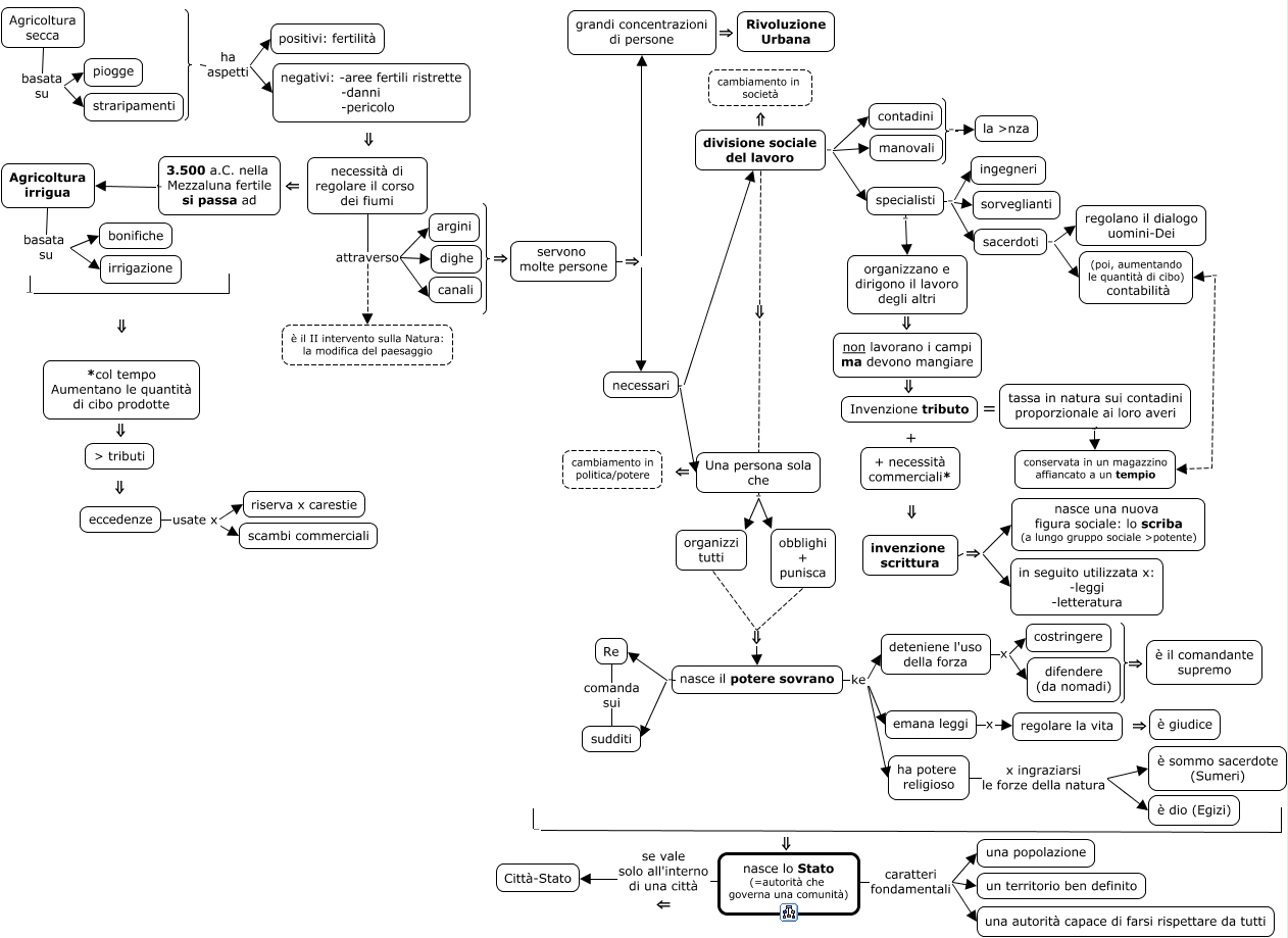 </mtext> </mfenced> </mrow> </math> ⇒ è il comandante supremo, necessità di regolare il corso dei fiumi attraverso è il II intervento sulla Natura: la modifica del paesaggio, nasce lo Stato (=autorità che governa una comunità) caratteri fondamentali una autorità capace di farsi rispettare da tutti, invenzione scrittura ⇒ in seguito utilizzata x: -leggi -letteratura, nasce lo Stato (=autorità che governa una comunità) caratteri fondamentali un territorio ben definito, nasce lo Stato (=autorità che governa una comunità) caratteri fondamentali una popolazione, divisione sociale del lavoro . specialisti, Invenzione tributo + + necessità commerciali*, Agricoltura irrigua basata su irrigazione, servono molte persone ⇒ necessari, negativi: -aree fertili ristrette -danni -pericolo ⇓ necessità di regolare il corso dei fiumi, necessari . Una persona sola che, obblighi + punisca ⇓ nasce il potere sovrano, necessità di regolare il corso dei fiumi attraverso dighe