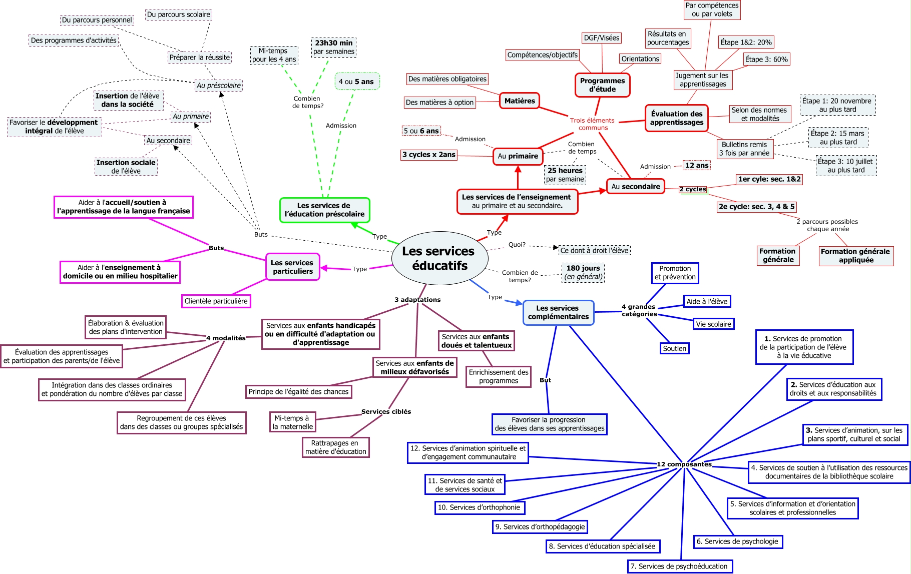 Cette carte de concepts créée avec IHMC CmapTools traite de: Les services éducatifs, Les services complémentaires 12 composantes 10. Services d’orthophonie, Les services complémentaires 12 composantes 1. Services de promotion de la participation de l’élève à la vie éducative, Les services complémentaires 12 composantes 8. Services d’éducation spécialisée, Préparer la réussite Du parcours scolaire, Matières Des matières obligatoires, Jugement sur les apprentissages Étape 3: 60%, Services aux enfants handicapés ou en difficulté d'adaptation ou d'apprentissage 4 modalités Regroupement de ces élèves dans des classes ou groupes spécialisés, Les services éducatifs Buts Au primaire, 2e cycle: sec. 3, 4 & 5 2 parcours possibles chaque année Formation générale, Au secondaire Insertion sociale de l'élève, Services aux enfants de milieux défavorisés Principe de l'égalité des chances, Bulletins remis 3 fois par année Étape 2: 15 mars au plus tard, Les services de l’enseignement au primaire et au secondaire. Au primaire, Au préscolaire Favoriser le développment intégral de l'élève, Matières Des matières à option, Au secondaire Favoriser le développment intégral de l'élève, Les services éducatifs Quoi? Ce dont à droit l'élève, Au secondaire 2 cycles 1er cyle: sec. 1&2, Les services éducatifs 3 adaptations Services aux enfants de milieux défavorisés, Services aux enfants doués et talentueux Enrichissement des programmes