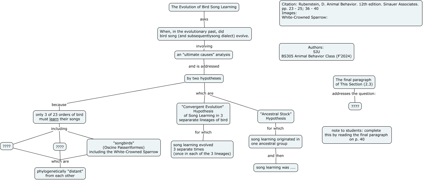 This Concept Map, created with IHMC CmapTools, has information related to: CMap 2.3 Evolution of Bird Song Learning, by two hypotheses which are "Convergent Evolution" Hypothesis of Song Learning in 3 separarate lineages of bird, by two hypotheses which are "Ancestral Stock" Hypothesis, by two hypotheses because only 3 of 23 orders of bird must learn their songs, The Evolution of Bird Song Learning asks When, in the evolutionary past, did bird song (and subsequentlysong dialect) evolve., When, in the evolutionary past, did bird song (and subsequentlysong dialect) evolve. involving an "ultimate causes" analysis, only 3 of 23 orders of bird must learn their songs including ????, song learning originated in one ancestral group and then song learning was ...., ???? which are phylogenetically "distant" from each other, The final paragraph of This Section (2.3) addresses the question: ????, only 3 of 23 orders of bird must learn their songs including "songbirds" (Oscine Passeriformes) including the White-Crowned Sparrow, "songbirds" (Oscine Passeriformes) including the White-Crowned Sparrow which are phylogenetically "distant" from each other, "Ancestral Stock" Hypothesis for which song learning originated in one ancestral group, ???? which are phylogenetically "distant" from each other, only 3 of 23 orders of bird must learn their songs including ????, an "ultimate causes" analysis and is addressed by two hypotheses, "Convergent Evolution" Hypothesis of Song Learning in 3 separarate lineages of bird for which song learning evolved 3 separate times (once in each of the 3 lineages)