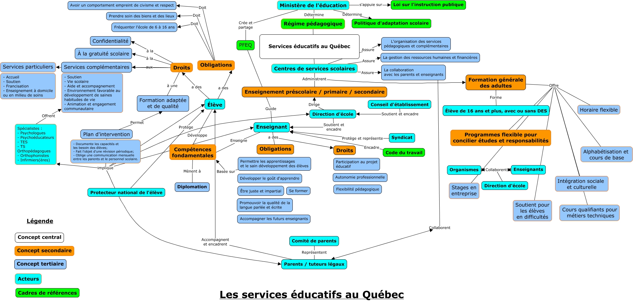 Cette carte de concepts créée avec IHMC CmapTools traite de: Schéma conceptuel, Formation générale des adultes Offre Soutient pour les élèves en difficultés, Centres de services scolaires Administrent Enseignement préscolaire / primaire / secondaire, Ministère de l'éducation Détermine Régime pédagogique, Formation générale des adultes Forme Élève de 16 ans et plus, avec ou sans DES, Organismes Collaborent Direction d'école, Obligations Doit Fréquenter l'école de 6 à 16 ans, Élève Développe Compétences fondamentales, Obligations Doit Avoir un comportement empreint de civisme et respect, ???? Collaborent Parents / tuteurs légaux, Enseignant a des Droits, Formation générale des adultes Offre Programmes flexible pour concilier études et responsabilités, Centres de services scolaires Administrent Formation générale des adultes, Droits à la Confidentialité, Ministère de l'éducation Crée et partage PFEQ, Droits ???? Services particuliers, Enseignant a des Obligations, Droits aux Services complémentaires, Plan d'intervention implique Spécialistes : - Psychologues - Psychoéducateurs - TES - TS Orthopédagogues - Orthophonistes - Infirmiers(ères), PFEQ Guide Enseignant, Plan d'intervention implique Parents / tuteurs légaux