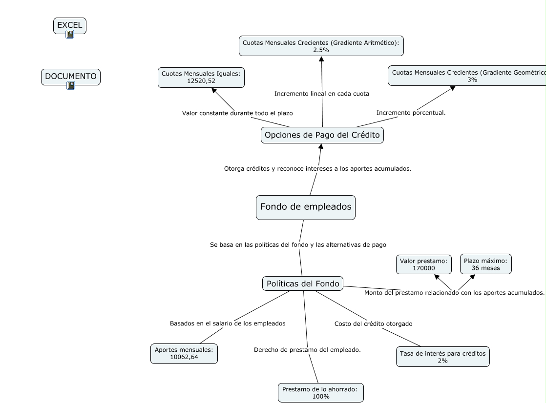 This Concept Map, created with IHMC CmapTools, has information related to: Cmap Fondo de empleados.cmap, Políticas del Fondo Costo del crédito otorgado Tasa de interés para créditos 2%, Opciones de Pago del Crédito Incremento porcentual. Cuotas Mensuales Crecientes (Gradiente Geométrico): 3%, Políticas del Fondo Derecho de prestamo del empleado. Prestamo de lo ahorrado: 100%, Opciones de Pago del Crédito Incremento lineal en cada cuota Cuotas Mensuales Crecientes (Gradiente Aritmético): 2.5%, Fondo de empleados Otorga créditos y reconoce intereses a los aportes acumulados. Opciones de Pago del Crédito, Políticas del Fondo Monto del prestamo relacionado con los aportes acumulados. Valor prestamo: 170000, Políticas del Fondo Monto del prestamo relacionado con los aportes acumulados. Plazo máximo: 36 meses, Políticas del Fondo Basados en el salario de los empleados Aportes mensuales: 10062,64, Fondo de empleados Se basa en las políticas del fondo y las alternativas de pago Políticas del Fondo, Opciones de Pago del Crédito Valor constante durante todo el plazo Cuotas Mensuales Iguales: 12520,52