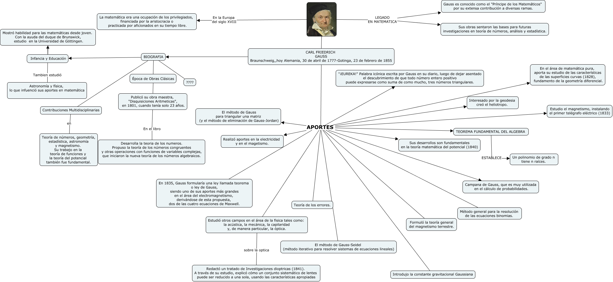 Este Cmap, tiene información relacionada con: Gauss, CARL FRIEDRICH GAUSS Braunschweig,,hoy Alemania, 30 de abril de 1777-Gotinga, 23 de febrero de 1855 APORTES El método de Gauss para triangular una matriz (y el método de eliminación de Gauss-Jordan), CARL FRIEDRICH GAUSS Braunschweig,,hoy Alemania, 30 de abril de 1777-Gotinga, 23 de febrero de 1855 APORTES En el área de matemática pura, aporta su estudio de las características de las superficies curvas (1828), fundamento de la geometría diferencial., CARL FRIEDRICH GAUSS Braunschweig,,hoy Alemania, 30 de abril de 1777-Gotinga, 23 de febrero de 1855 APORTES Campana de Gauss, que es muy utilizada en el cálculo de probabilidades., CARL FRIEDRICH GAUSS Braunschweig,,hoy Alemania, 30 de abril de 1777-Gotinga, 23 de febrero de 1855 APORTES En 1835, Gauss formularía una ley llamada teorema o ley de Gauss, siendo uno de sus aportes más grandes en el área del electromagnetismo, derivándose de esta propuesta, dos de las cuatro ecuaciones de Maxwell., CARL FRIEDRICH GAUSS Braunschweig,,hoy Alemania, 30 de abril de 1777-Gotinga, 23 de febrero de 1855 APORTES El método de Gauss-Seidel (método iterativo para resolver sistemas de ecuaciones lineales), Mostró habilidad para las matemáticas desde joven. Con la ayuda del duque de Brunswick, estudio en la Universidad de Göttingen. Tambien estudió Astronomía y física, lo que infuenció sus aportes en matemática, CARL FRIEDRICH GAUSS Braunschweig,,hoy Alemania, 30 de abril de 1777-Gotinga, 23 de febrero de 1855 APORTES Sus desarrollos son fundamentales en la teoría matemática del potencial (1840), LEGADO EN MATEMATICA Gauss es conocido como el "Príncipe de los Matemáticos" por su extensa contribución a diversas ramas., BIOGRAFIA Contribuciones Multidisciplinarias, LEGADO EN MATEMATICA Sus obras sentaron las bases para futuras investigaciones en teoría de números, análisis y estadística., BIOGRAFIA Época de Obras Clásicas, CARL FRIEDRICH GAUSS Braunschweig,,hoy Alemania, 30 de abril de 1777-Gotinga, 23 de febrero de 1855 APORTES TEOREMA FUNDAMENTAL DEL ALGEBRA, Época de Obras Clásicas Publicó su obra maestra, "Disquisiciones Aritmeticas", en 1801, cuando tenía solo 23 años., Estudió otros campos en el área de la fisica tales como: la acústica, la mecánica, la capilaridad y, de manera particular, la óptica. sobre la optica Redactó un tratado de Investigaciones dioptricas (1841). A través de su estudio, explicó cómo un conjunto sistemático de lentes puede ser reducido a una sola, usando las características apropiadas, CARL FRIEDRICH GAUSS Braunschweig,,hoy Alemania, 30 de abril de 1777-Gotinga, 23 de febrero de 1855 APORTES Estudio el magnetismo, instalando el primer telégrafo eléctrico (1833), CARL FRIEDRICH GAUSS Braunschweig,,hoy Alemania, 30 de abril de 1777-Gotinga, 23 de febrero de 1855 APORTES "¡EUREKA!" Palabra icónica escrita por Gauss en su diario, luego de dejar asentado el descubrimiento de que todo número entero positivo puede expresarse como suma de como mucho, tres números triangulares., Publicó su obra maestra, "Disquisiciones Aritmeticas", en 1801, cuando tenía solo 23 años. En el libro Desarrolla la teoria de los numeros. Propuso la teoría de los números congruentes y otras operaciones con funciones de variables complejas, que iniciaron la nueva teoría de los números algebraicos., CARL FRIEDRICH GAUSS Braunschweig,,hoy Alemania, 30 de abril de 1777-Gotinga, 23 de febrero de 1855 APORTES Realizó aportes en la electricidad y en el magetismo., CARL FRIEDRICH GAUSS Braunschweig,,hoy Alemania, 30 de abril de 1777-Gotinga, 23 de febrero de 1855 APORTES Método general para la resolución de las ecuaciones binomias., TEOREMA FUNDAMENTAL DEL ALGEBRA ESTABLECE Un polinomio de grado n tiene n raíces.