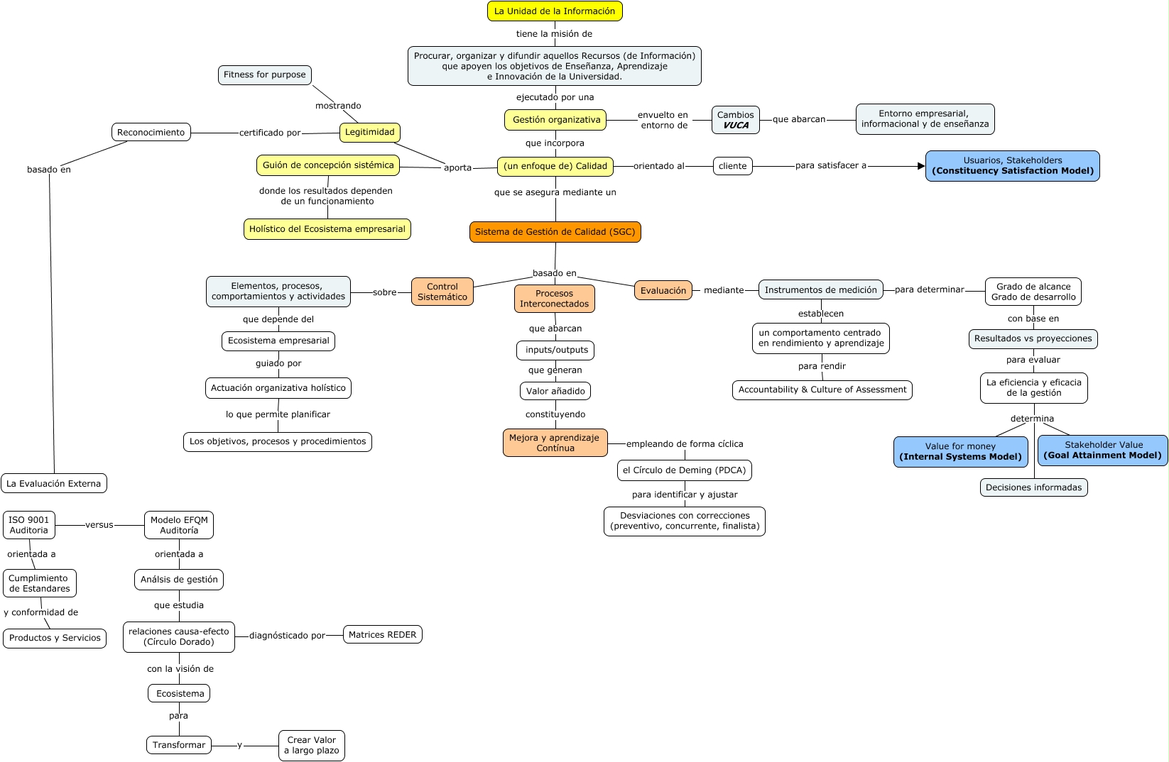 This Concept Map, created with IHMC CmapTools, has information related to: TW_intento shared, Guión de concepción sistémica donde los resultados dependen de un funcionamiento Holístico del Ecosistema empresarial, Mejora y aprendizaje Contínua empleando de forma cíclica el Círculo de Deming (PDCA), relaciones causa-efecto (Círculo Dorado) diagnósticado por Matrices REDER, Elementos, procesos, comportamientos y actividades que depende del Ecosistema empresarial, Instrumentos de medición establecen un comportamento centrado en rendimiento y aprendizaje, Grado de alcance Grado de desarrollo con base en Resultados vs proyecciones, cliente para satisfacer a Usuarios, Stakeholders (Constituency Satisfaction Model), Sistema de Gestión de Calidad (SGC) basado en Procesos Interconectados, relaciones causa-efecto (Círculo Dorado) con la visión de Ecosistema, La eficiencia y eficacia de la gestión determina Stakeholder Value (Goal Attainment Model), Modelo EFQM Auditoría orientada a Análsis de gestión, Gestión organizativa envuelto en entorno de Cambios VUCA, (un enfoque de) Calidad aporta Legitimidad, el Círculo de Deming (PDCA) para identificar y ajustar Desviaciones con correcciones (preventivo, concurrente, finalista), Análsis de gestión que estudia relaciones causa-efecto (Círculo Dorado), Legitimidad mostrando Fitness for purpose, Ecosistema para Transformar, La eficiencia y eficacia de la gestión determina Value for money (Internal Systems Model), Transformar y Crear Valor a largo plazo, Legitimidad certificado por Reconocimiento