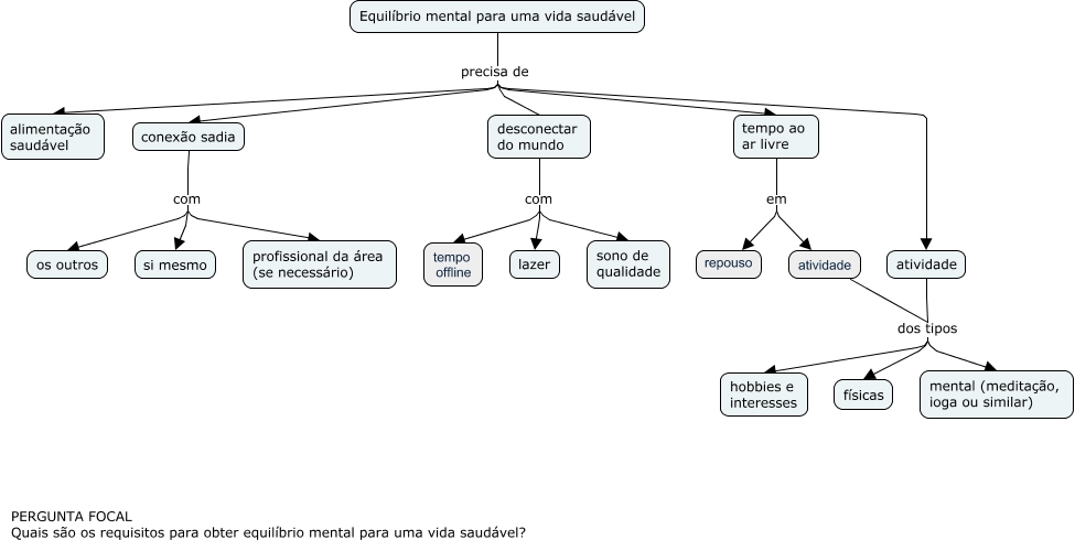 Esse mapa conceitual, produzido no IHMC CmapTools, tem a informação relacionada a: MC-IND-FINAL-REVISADA-ANDRADE, conexão sadia com profissional da área (se necessário), desconectar do mundo com tempo offline, tempo ao ar livre em repouso, atividade dos tipos mental (meditação, ioga ou similar), Equilíbrio mental para uma vida saudável precisa de atividade, Equilíbrio mental para uma vida saudável precisa de desconectar do mundo, conexão sadia com si mesmo, atividade dos tipos mental (meditação, ioga ou similar), atividade dos tipos físicas, desconectar do mundo com sono de qualidade, Equilíbrio mental para uma vida saudável precisa de conexão sadia, desconectar do mundo com lazer, atividade dos tipos físicas, atividade dos tipos hobbies e interesses, Equilíbrio mental para uma vida saudável precisa de tempo ao ar livre, conexão sadia com os outros, atividade dos tipos hobbies e interesses, Equilíbrio mental para uma vida saudável precisa de alimentação saudável, tempo ao ar livre em atividade
