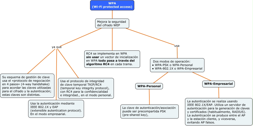 Este Cmap, tiene información relacionada con: WPA, WPA-Personal La clave de autenticación/asociación puede ser precompartida PSK (pre-shared key),, WPA (Wi-Fi protected access) Mejora la seguridad del cifrado WEP, Dos modos de operación: ∙ WPA-PSK o WPA-Personal ∙ WPA-802.1X o WPA-Empresarial WPA-Empresarial, Mejora la seguridad del cifrado WEP RC4 se implementa en WPA sin usar un vector de inicialización en WPA todo pasa a través del algoritmo RC4 en cada trama., Mejora la seguridad del cifrado WEP ya que Su esquema de gestión de clave usa el «protocolo de negociación en 4 pasos» (4-way handshake) para acordar las claves utilizadas para el cifrado y la autenticación; estas claves son distintas., Mejora la seguridad del cifrado WEP ya que Usa el protocolo de integridad de clave temporal TKIP/RC4 (temporal key integrity protocol), con RC4 para la confidencialidad e integridad., en el modo personal., Mejora la seguridad del cifrado WEP usa Dos modos de operación: ∙ WPA-PSK o WPA-Personal ∙ WPA-802.1X o WPA-Empresarial, Mejora la seguridad del cifrado WEP ya que Usa la autenticación mediante IEEE 802.1X y EAP (extensible autentication protocol). En el modo empresarial., WPA-Empresarial La autenticación se realiza usando IEEE 802.1X/EAP. Utiliza un servidor de autenticación para la generación de claves y certificados (habitualmente, RADIUS). La autenticación se produce entre el AP y la estación cliente, y viceversa, evitando AP falsos., Dos modos de operación: ∙ WPA-PSK o WPA-Personal ∙ WPA-802.1X o WPA-Empresarial WPA-Personal