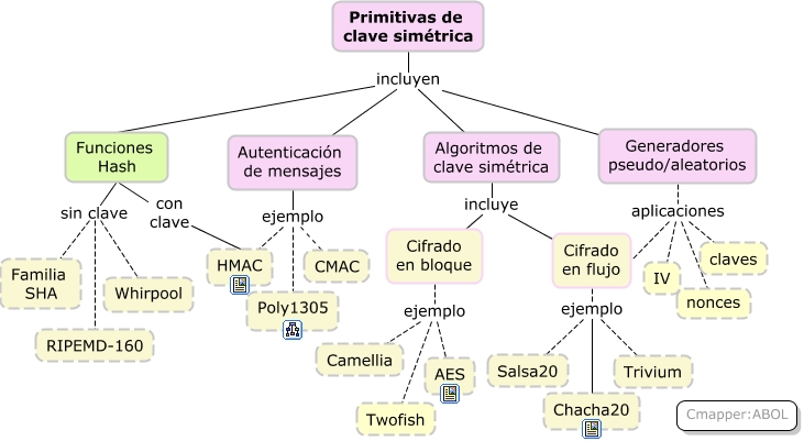 Este Cmap, tiene información relacionada con: PRIMITIVAS de clave simétrica, Generadores pseudo/aleatorios aplicaciones claves, Funciones Hash sin clave RIPEMD-160, Cifrado en flujo ejemplo Salsa20, Cifrado en bloque ejemplo Twofish, Algoritmos de clave simétrica incluye Cifrado en flujo, Funciones Hash sin clave Familia SHA, Cifrado en flujo ejemplo Chacha20, Primitivas de clave simétrica incluyen Funciones Hash, Cifrado en flujo ejemplo Trivium, Autenticación de mensajes ejemplo CMAC, Autenticación de mensajes ejemplo Poly1305, Generadores pseudo/aleatorios aplicaciones IV, Algoritmos de clave simétrica incluye Cifrado en bloque, Primitivas de clave simétrica incluyen Autenticación de mensajes, Generadores pseudo/aleatorios aplicaciones nonces, Primitivas de clave simétrica incluyen Generadores pseudo/aleatorios, Primitivas de clave simétrica incluyen Algoritmos de clave simétrica, Generadores pseudo/aleatorios aplicaciones Cifrado en flujo, Autenticación de mensajes ejemplo HMAC, Cifrado en bloque ejemplo Camellia