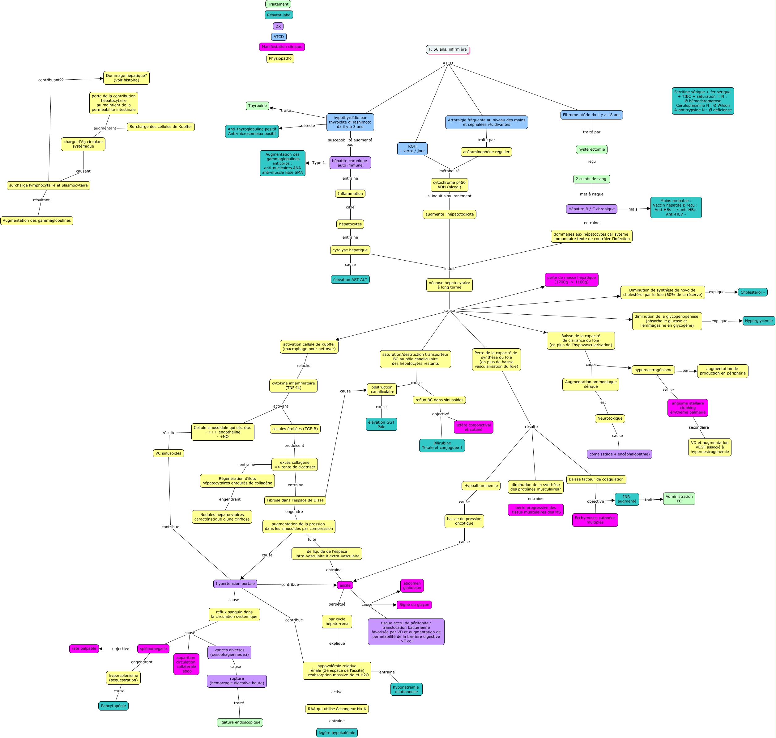 Cette carte de concepts créée avec IHMC CmapTools traite de: APP9, F, 56 ans, infirmière ATCD Fibrome utérin dx il y a 18 ans, hypertension portale contribue hypovolémie relative rénale (3e espace de l'ascite) - réabsorption massive Na et H2O, saturation/destruction transporteur BC au pôle canaliculaire des hépatocytes restants cause reflux BC dans sinusoides, nécrose hépatocytaire à long terme cause activation cellule de Kupffer (macrophage pour nettoyer), Baisse de la capacité de clairance du foie (en plus de l'hypovascularisation) cause Augmentation ammoniaque sérique, baisse de pression oncotique cause ascite, 2 culots de sang met à risque Hépatite B / C chronique, charge d'Ag circulant systémique causant surcharge lymphocytaire et plasmocytaire, cytochrome p450 ADH (alcool) si induit simultanément augmente l'hépatotoxicité, nécrose hépatocytaire à long terme cause perte de masse hépatique (1700g -> 1100g), cytolyse hépatique induit nécrose hépatocytaire à long terme, hypovolémie relative rénale (3e espace de l'ascite) - réabsorption massive Na et H2O active RAA qui utilise échangeur Na-K, ascite cause abdomen globuleux, Perte de la capacité de synthèse du foie (en plus de baisse vascularisation du foie) résulte Hypoalbuminémie, varices diverses (oesophagiennes ici) cause rupture (hémorragie digestive haute), Inflammation cible hépatocytes, Perte de la capacité de synthèse du foie (en plus de baisse vascularisation du foie) résulte Baisse facteur de coagulation, nécrose hépatocytaire à long terme cause Baisse de la capacité de clairance du foie (en plus de l'hypovascularisation), hyperoestrogénisme par augmentation de production en périphérie, surcharge lymphocytaire et plasmocytaire contribuant?? Dommage hépatique? (voir histoire)