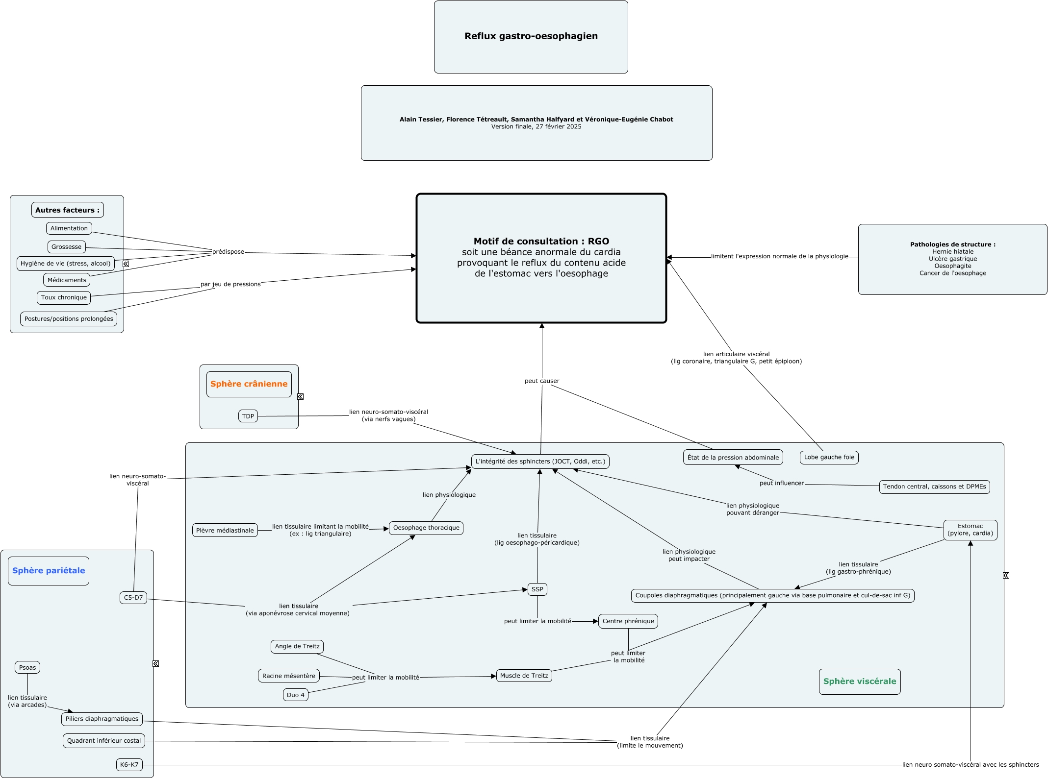 This Concept Map, created with IHMC CmapTools, has information related to: RGO V3VP.cmap, SSP lien tissulaire (lig oesophago-péricardique) L'intégrité des sphincters (JOCT, Oddi, etc.), Pathologies de structure : Hernie hiatale Ulcère gastrique Oesophagite Cancer de l'oesophage limitent l'expression normale de la physiologie Motif de consultation : RGO soit une béance anormale du cardia provoquant le reflux du contenu acide de l'estomac vers l'oesophage, Tendon central, caissons et DPMEs peut influencer État de la pression abdominale, TDP lien neuro-somato-viscéral (via nerfs vagues) L'intégrité des sphincters (JOCT, Oddi, etc.), Alimentation prédispose Motif de consultation : RGO soit une béance anormale du cardia provoquant le reflux du contenu acide de l'estomac vers l'oesophage, Piliers diaphragmatiques lien tissulaire (limite le mouvement) Coupoles diaphragmatiques (principalement gauche via base pulmonaire et cul-de-sac inf G), Angle de Treitz peut limiter la mobilité Muscle de Treitz, Postures/positions prolongées par jeu de pressions Motif de consultation : RGO soit une béance anormale du cardia provoquant le reflux du contenu acide de l'estomac vers l'oesophage, Muscle de Treitz peut limiter la mobilité Coupoles diaphragmatiques (principalement gauche via base pulmonaire et cul-de-sac inf G), Centre phrénique peut limiter la mobilité Coupoles diaphragmatiques (principalement gauche via base pulmonaire et cul-de-sac inf G), K6-K7 lien neuro somato-viscéral avec les sphincters Estomac (pylore, cardia), Quadrant inférieur costal lien tissulaire (limite le mouvement) Coupoles diaphragmatiques (principalement gauche via base pulmonaire et cul-de-sac inf G), L'intégrité des sphincters (JOCT, Oddi, etc.) peut causer Motif de consultation : RGO soit une béance anormale du cardia provoquant le reflux du contenu acide de l'estomac vers l'oesophage, Estomac (pylore, cardia) lien physiologique pouvant déranger L'intégrité des sphincters (JOCT, Oddi, etc.), Lobe gauche foie lien articulaire viscéral (lig coronaire, triangulaire G, petit épiploon) Motif de consultation : RGO soit une béance anormale du cardia provoquant le reflux du contenu acide de l'estomac vers l'oesophage, Plèvre médiastinale lien tissulaire limitant la mobilité (ex : lig triangulaire) Oesophage thoracique, Racine mésentère peut limiter la mobilité Muscle de Treitz, Hygiène de vie (stress, alcool) prédispose Motif de consultation : RGO soit une béance anormale du cardia provoquant le reflux du contenu acide de l'estomac vers l'oesophage, Toux chronique par jeu de pressions Motif de consultation : RGO soit une béance anormale du cardia provoquant le reflux du contenu acide de l'estomac vers l'oesophage, C5-D7 lien tissulaire (via aponévrose cervical moyenne) SSP