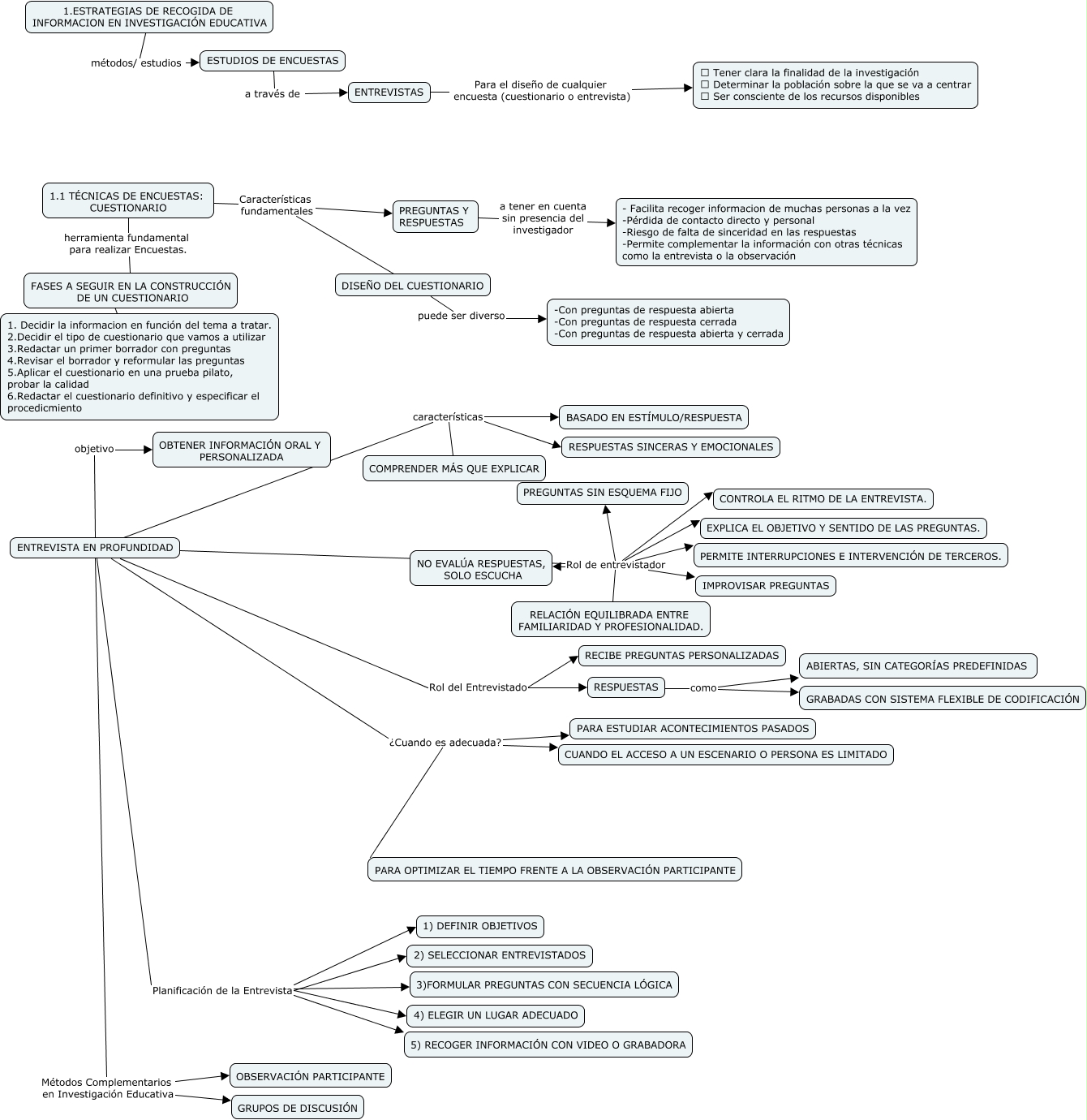 Este Cmap, tiene información relacionada con: GRUPO B - TEMA 4 METODOLOGIA, ENTREVISTA EN PROFUNDIDAD Rol de entrevistador IMPROVISAR PREGUNTAS, ENTREVISTA EN PROFUNDIDAD ¿Cuando es adecuada? CUANDO EL ACCESO A UN ESCENARIO O PERSONA ES LIMITADO, ENTREVISTA EN PROFUNDIDAD Rol del Entrevistado RECIBE PREGUNTAS PERSONALIZADAS, ENTREVISTA EN PROFUNDIDAD características BASADO EN ESTÍMULO/RESPUESTA, ENTREVISTA EN PROFUNDIDAD Rol del Entrevistado RESPUESTAS, ENTREVISTA EN PROFUNDIDAD Rol de entrevistador NO EVALÚA RESPUESTAS, SOLO ESCUCHA, ENTREVISTA EN PROFUNDIDAD Planificación de la Entrevista 1) DEFINIR OBJETIVOS, ENTREVISTA EN PROFUNDIDAD Rol de entrevistador PERMITE INTERRUPCIONES E INTERVENCIÓN DE TERCEROS., ENTREVISTA EN PROFUNDIDAD Planificación de la Entrevista 4) ELEGIR UN LUGAR ADECUADO, ENTREVISTA EN PROFUNDIDAD ¿Cuando es adecuada? PARA ESTUDIAR ACONTECIMIENTOS PASADOS, ENTREVISTA EN PROFUNDIDAD Planificación de la Entrevista 2) SELECCIONAR ENTREVISTADOS, 1.ESTRATEGIAS DE RECOGIDA DE INFORMACION EN INVESTIGACIÓN EDUCATIVA métodos/ estudios ESTUDIOS DE ENCUESTAS, ENTREVISTA EN PROFUNDIDAD Planificación de la Entrevista 5) RECOGER INFORMACIÓN CON VIDEO O GRABADORA, ENTREVISTA EN PROFUNDIDAD ¿Cuando es adecuada? PARA OPTIMIZAR EL TIEMPO FRENTE A LA OBSERVACIÓN PARTICIPANTE, ENTREVISTA EN PROFUNDIDAD Rol de entrevistador EXPLICA EL OBJETIVO Y SENTIDO DE LAS PREGUNTAS., ESTUDIOS DE ENCUESTAS a través de ENTREVISTAS, PREGUNTAS Y RESPUESTAS a tener en cuenta sin presencia del investigador - Facilita recoger informacion de muchas personas a la vez -Pérdida de contacto directo y personal -Riesgo de falta de sinceridad en las respuestas -Permite complementar la información con otras técnicas como la entrevista o la observación, ENTREVISTAS Para el diseño de cualquier encuesta (cuestionario o entrevista) ✓ Tener clara la finalidad de la investigación ✓ Determinar la población sobre la que se va a centrar ✓ Ser consciente de los recursos disponibles, DISEÑO DEL CUESTIONARIO puede ser diverso -Con preguntas de respuesta abierta -Con preguntas de respuesta cerrada -Con preguntas de respuesta abierta y cerrada, ENTREVISTA EN PROFUNDIDAD Rol de entrevistador PREGUNTAS SIN ESQUEMA FIJO