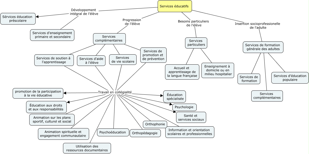 This Concept Map, created with IHMC CmapTools, has information related to: Sevices éducatifs 2, Services de vie scolaire Travail en collégialité Animation spirituelle et engagement communautaire, Services de promotion et de prévention Travail en collégialité Orthophonie, Services complémentaires Services d'aide à l'élève, Services de vie scolaire Travail en collégialité Psychoéducation, Services d'aide à l'élève Travail en collégialité Animation sur les plans sportif, culturel et social, Services éducatifs Insertion socioprofessionelle de l'adulte Services de formation générale des adultes, Services d'aide à l'élève Travail en collégialité Éducation aux droits et aux responsabilités, Services de soutien à l'apprentissage Travail en collégialité Santé et services sociaux, Services de promotion et de prévention Travail en collégialité Psychologie, Services d'aide à l'élève Travail en collégialité Orthophonie, Services de vie scolaire Travail en collégialité Utilisation des ressources documentaires, Services éducatifs Besoins particuliers de l'élève Services particuliers, Services d'aide à l'élève Travail en collégialité Information et orientation scolaires et professionnelles, Services éducatifs Progression de l’élève Services complémentaires, Services complémentaires Services de promotion et de prévention, Services de soutien à l'apprentissage Travail en collégialité Utilisation des ressources documentaires, Services de promotion et de prévention Travail en collégialité Animation spirituelle et engagement communautaire, Services de vie scolaire Travail en collégialité Psychologie, Services complémentaires Services de soutien à l'apprentissage, Services de promotion et de prévention Travail en collégialité Animation sur les plans sportif, culturel et social