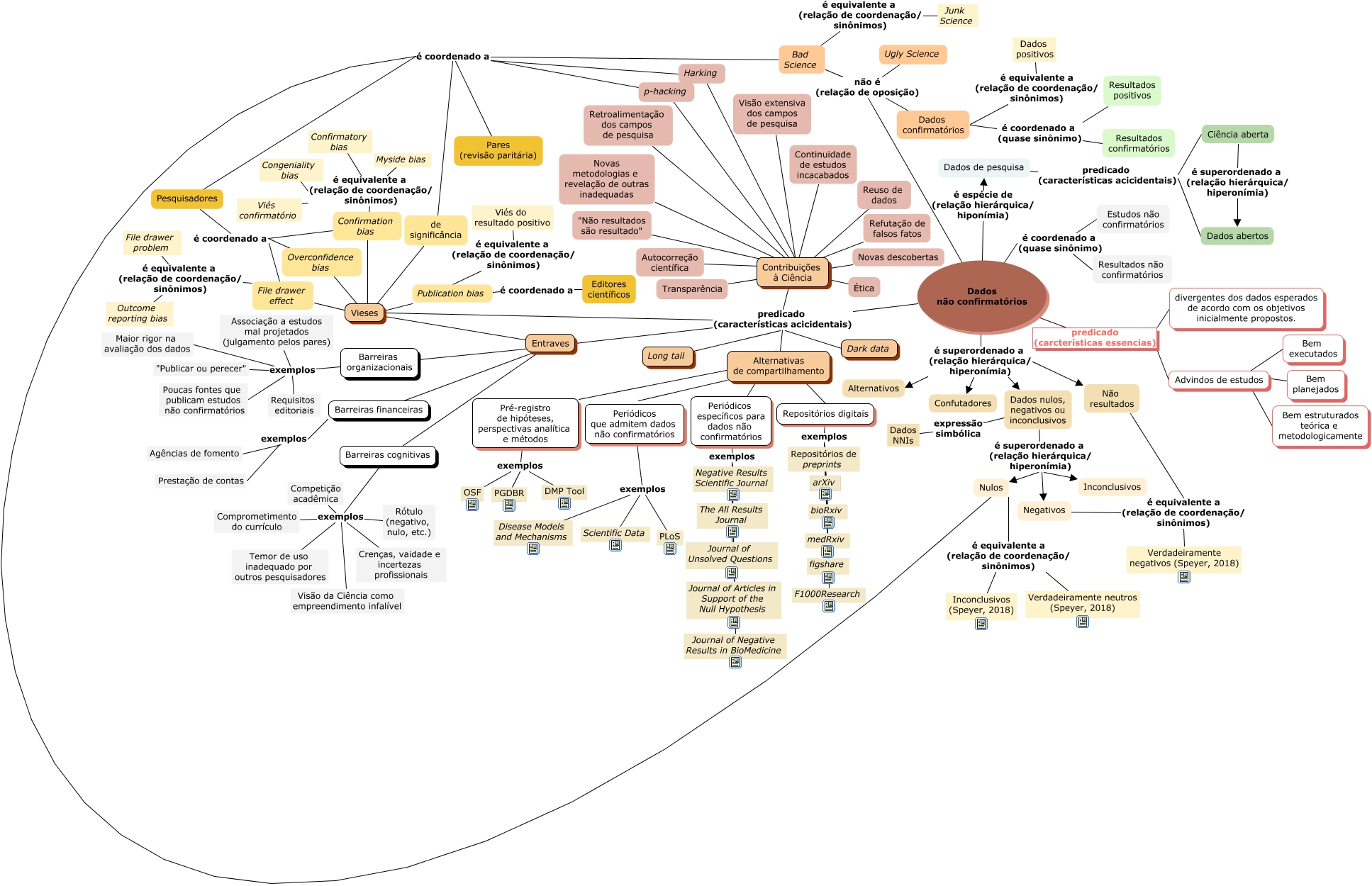 Esse mapa conceitual, produzido no IHMC CmapTools, tem a informação relacionada a: ISKO, Repositórios digitais exemplos figshare, File drawer effect é coordenado a Pesquisadores, Dados não confirmatórios predicado (características acicidentais) Contribuições à Ciência, Dados não confirmatórios é coordenado a (quase sinônimo) Resultados não confirmatórios, Dados não confirmatórios não é (relação de oposição) Ugly Science, Dados não confirmatórios é espécie de (relação hierárquica/ hiponímia) Dados de pesquisa, Reuso de dados "Não resultados são resultado", de significância é coordenado a Bad Science, Dados não confirmatórios é coordenado a (quase sinônimo) Estudos não confirmatórios, Novas descobertas Continuidade de estudos incacabados, Dados não confirmatórios é superordenado a (relação hierárquica/ hiperonímia) Dados nulos, negativos ou inconclusivos, Publication bias é equivalente a (relação de coordenação/ sinônimos) Viés do resultado positivo, Periódicos específicos para dados não confirmatórios exemplos Journal of Articles in Support of the Null Hypothesis, p-hacking Continuidade de estudos incacabados, Repositórios digitais exemplos bioRxiv, Confirmation bias é equivalente a (relação de coordenação/ sinônimos) Congeniality bias, Barreiras cognitivas exemplos Crenças, vaidade e incertezas profissionais, Barreiras cognitivas exemplos Comprometimento do currículo, Nulos é equivalente a (relação de coordenação/ sinônimos) Inconclusivos (Speyer, 2018), Vieses de significância