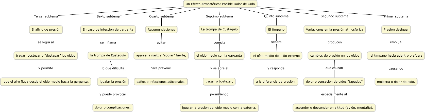 Este Cmap, tiene información relacionada con: Un Efecto Atmosférico - Posible Dolor de Oído, El alivio de presión se logra al tragar, bostezar o “destapar” los oídos, Un Efecto Atmosférico: Posible Dolor de Oído Cuarto subtema Recomendaciones, la trompa de Eustaquio lo que dificulta igualar la presión, La trompa de Eustaquio conecta el oído medio con la garganta, Un Efecto Atmosférico: Posible Dolor de Oído Quinto subtema El tímpano, el oído medio del oído externo y responde a la diferencia de presión., tragar, bostezar o “destapar” los oídos y permite que el aire fluya desde el oído medio hacia la garganta., Un Efecto Atmosférico: Posible Dolor de Oído Tercer subtema El alivio de presión, Un Efecto Atmosférico: Posible Dolor de Oído Primer subtema Presión desigual, aparse la nariz y “soplar” fuerte, para prevenir daños o infecciones adicionales., Un Efecto Atmosférico: Posible Dolor de Oído Segundo subtema Variaciones en la presión atmosférica, dolor o sensación de oídos “tapados” especialmente al ascender o descender en altitud (avión, montaña)., cambios de presión en los oídos que causan dolor o sensación de oídos “tapados”, Un Efecto Atmosférico: Posible Dolor de Oído Sexto subtema En caso de infección de garganta, Presión desigual empuja el tímpano hacia adentro o afuera, el tímpano hacia adentro o afuera causando molestia o dolor de oído., El tímpano separa el oído medio del oído externo, tragar o bostezar, permitiendo igualar la presión del oído medio con la externa., En caso de infección de garganta se inflama la trompa de Eustaquio, el oído medio con la garganta y se abre al tragar o bostezar,