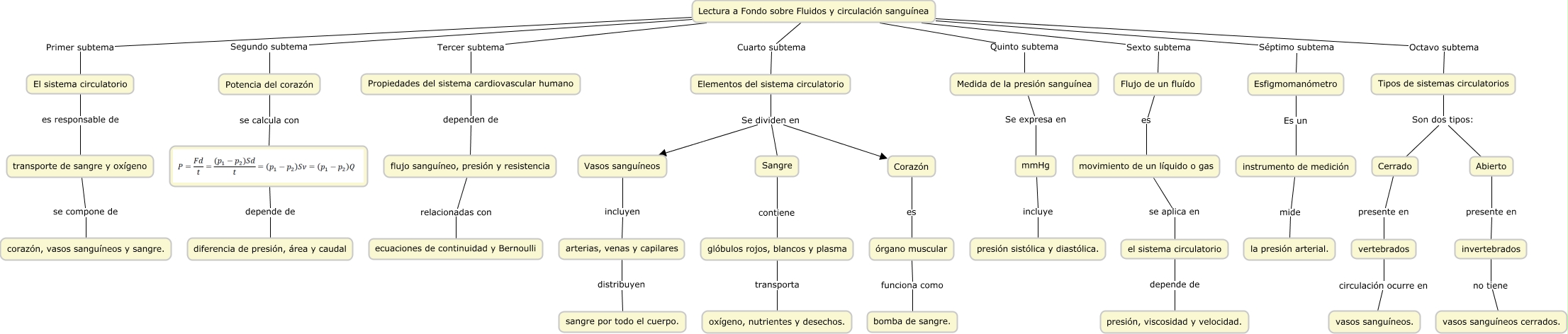 Este Cmap, tiene información relacionada con: Lectura a Fondo sobre Fluidos y Circulación Sanguínea, Medida de la presión sanguínea Se expresa en mmHg, Abierto presente en invertebrados, Tipos de sistemas circulatorios Son dos tipos: Cerrado, transporte de sangre y oxígeno se compone de corazón, vasos sanguíneos y sangre., glóbulos rojos, blancos y plasma transporta oxígeno, nutrientes y desechos., Esfigmomanómetro Es un instrumento de medición, arterias, venas y capilares distribuyen sangre por todo el cuerpo., mmHg incluye presión sistólica y diastólica., Flujo de un fluído es movimiento de un líquido o gas, Elementos del sistema circulatorio Se dividen en Vasos sanguíneos, Lectura a Fondo sobre Fluidos y circulación sanguínea Séptimo subtema Esfigmomanómetro, Sangre contiene glóbulos rojos, blancos y plasma, Vasos sanguíneos incluyen arterias, venas y capilares, flujo sanguíneo, presión y resistencia relacionadas con ecuaciones de continuidad y Bernoulli, Elementos del sistema circulatorio Se dividen en Sangre, Lectura a Fondo sobre Fluidos y circulación sanguínea Quinto subtema Medida de la presión sanguínea, <math xmlns="http://www.w3.org/1998/Math/MathML"> <mtext> </mtext> </math> depende de diferencia de presión, área y caudal, órgano muscular funciona como bomba de sangre., Elementos del sistema circulatorio Se dividen en Corazón, vertebrados circulación ocurre en vasos sanguíneos.