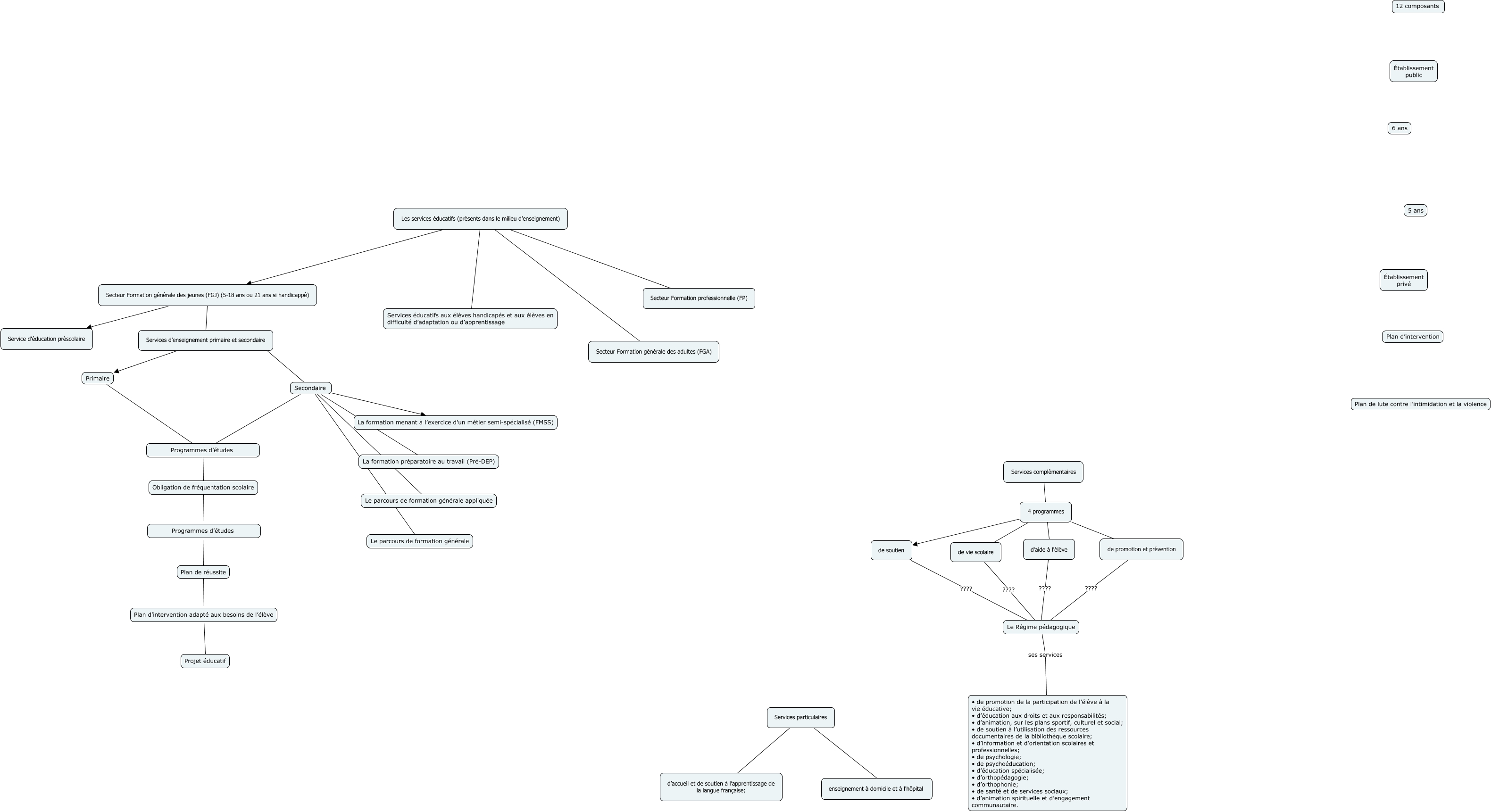 Cette carte de concepts créée avec IHMC CmapTools traite de: Concept 1.2. Victoria, Plan d’intervention adapté aux besoins de l’élève Projet éducatif, Services d’enseignement primaire et secondaire Primaire, d'aide à l'élève ???? Le Régime pédagogique, de soutien ???? Le Régime pédagogique, de vie scolaire ???? Le Régime pédagogique, Services particulaires enseignement à domicile et à l'hôpital, Secondaire La formation menant à l’exercice d’un métier semi-spécialisé (FMSS), Le Régime pédagogique ses services • de promotion de la participation de l’élève à la vie éducative; • d’éducation aux droits et aux responsabilités; • d’animation, sur les plans sportif, culturel et social; • de soutien à l’utilisation des ressources documentaires de la bibliothèque scolaire; • d’information et d’orientation scolaires et professionnelles; • de psychologie; • de psychoéducation; • d’éducation spécialisée; • d’orthopédagogie; • d’orthophonie; • de santé et de services sociaux; • d’animation spirituelle et d’engagement communautaire., de promotion et prévention ???? Le Régime pédagogique, Secondaire La formation préparatoire au travail (Pré-DEP), 4 programmes de soutien, Secteur Formation générale des jeunes (FGJ) (5-18 ans ou 21 ans si handicappé) Services d’enseignement primaire et secondaire, 4 programmes de promotion et prévention, Obligation de fréquentation scolaire Programmes d’études, Secondaire Le parcours de formation générale appliquée, Programmes d’études Plan de réussite, Les services éducatifs (présents dans le milieu d’enseignement) Secteur Formation professionnelle (FP), Services particulaires d’accueil et de soutien à l’apprentissage de la langue française;, Plan de réussite Plan d’intervention adapté aux besoins de l’élève, 4 programmes d'aide à l'élève