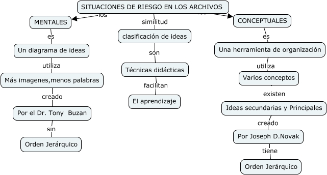 Este Cmap, tiene información relacionada con: SITUACIONES DE RIESGO EN LOS ARCHIVOS, SITUACIONES DE RIESGO EN LOS ARCHIVOS los MENTALES, SITUACIONES DE RIESGO EN LOS ARCHIVOS los CONCEPTUALES, Ideas secundarias y Principales creado Por Joseph D.Novak, SITUACIONES DE RIESGO EN LOS ARCHIVOS similitud clasificación de ideas, Varios conceptos existen Ideas secundarias y Principales, CONCEPTUALES es Una herramienta de organización, Una herramienta de organización utiliza Varios conceptos, Por el Dr. Tony Buzan sin Orden Jerárquico, Un diagrama de ideas utiliza Más imagenes,menos palabras, Más imagenes,menos palabras creado Por el Dr. Tony Buzan, Por Joseph D.Novak tiene Orden Jerárquico, Técnicas didácticas facilitan El aprendizaje, clasificación de ideas son Técnicas didácticas, MENTALES es Un diagrama de ideas