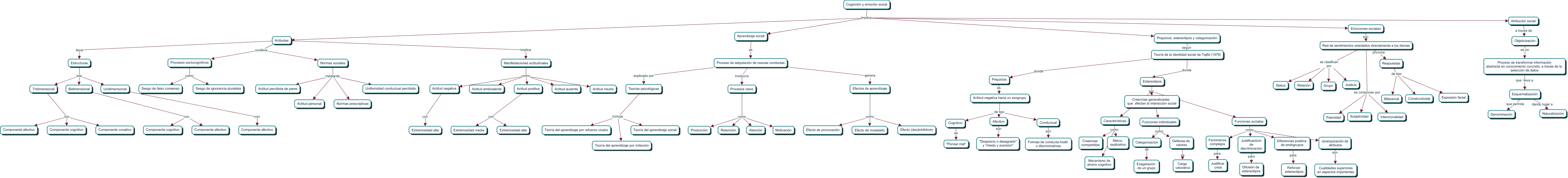Este Cmap, tiene información relacionada con: CyEsocial, Manifestaciones actitudinales como Actitud neutra, Proceso de adquisición de nuevas conductas explicado por Teorías psicológicas, Teorías psicológicas incluye Teoría del aprendizaje social, Efectos de aprendizaje como Efecto de provocación, Bidimensional con Componente afectivo, Procesos sociocognitivos como Sesgo de ignorancia pluralista, Procesos clave como Motivación, Procesos clave como Atención, Actitudes conlleva Procesos sociocognitivos, Estereotipos son Funciones individuales, Efectos de aprendizaje como Efecto (des)inhibitorio, Red de sentimientos orientados directamente a los demas se componen por Intencionalidad, Funciones sociales como Diferencias positiva de endogrupos, Estructuras sea Tridimensional, Diferencias positiva de endogrupos para Reforzar estereotipos, Efectos de aprendizaje como Efecto de modelado, Teoría de la identidad social de Tajfel (1979) donde Estereotipos, Normas sociales mediante Actitud personal, Actitud negativa con Extremosidad alta, Red de sentimientos orientados directamente a los demas se clasifican por Status
