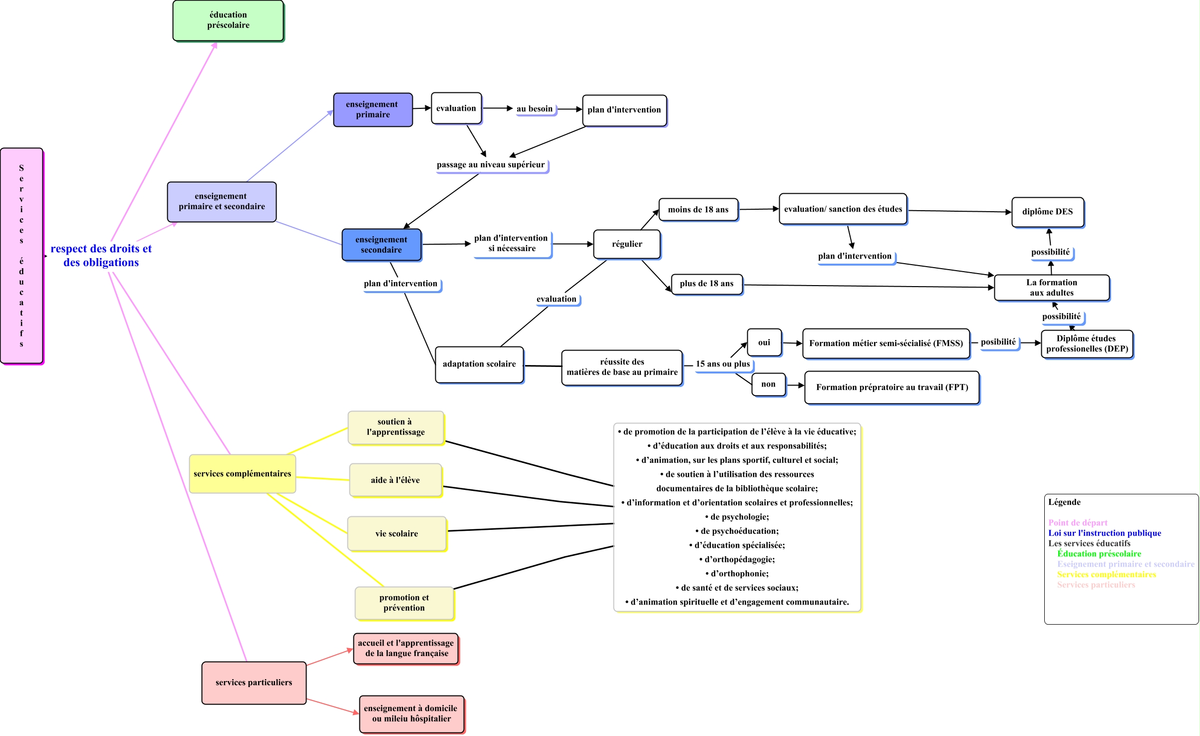 Cette carte de concepts créée avec IHMC CmapTools traite de: victoria_carte_19.03.2025, enseignement secondaire plan d'intervention si nécessaire régulier, plan d'intervention passage au niveau supérieur enseignement secondaire, S e r v i c e s é d u c a t i f s respect des droits et des obligations services complémentaires, services particuliers accueil et l'apprentissage de la langue française, • de promotion de la participation de l’élève à la vie éducative; • d’éducation aux droits et aux responsabilités; • d’animation, sur les plans sportif, culturel et social; • de soutien à l’utilisation des ressources documentaires de la bibliothèque scolaire; • d’information et d’orientation scolaires et professionnelles; • de psychologie; • de psychoéducation; • d’éducation spécialisée; • d’orthopédagogie; • d’orthophonie; • de santé et de services sociaux; • d’animation spirituelle et d’engagement communautaire. promotion et prévention, régulier moins de 18 ans, Diplôme études professionelles (DEP) possibilité La formation aux adultes, réussite des matières de base au primaire 15 ans ou plus oui, moins de 18 ans evaluation/ sanction des études, S e r v i c e s é d u c a t i f s respect des droits et des obligations enseignement primaire et secondaire, Formation métier semi-sécialisé (FMSS) posibilité Diplôme études professionelles (DEP), services particuliers enseignement à domicile ou mileiu hôspitalier, • de promotion de la participation de l’élève à la vie éducative; • d’éducation aux droits et aux responsabilités; • d’animation, sur les plans sportif, culturel et social; • de soutien à l’utilisation des ressources documentaires de la bibliothèque scolaire; • d’information et d’orientation scolaires et professionnelles; • de psychologie; • de psychoéducation; • d’éducation spécialisée; • d’orthopédagogie; • d’orthophonie; • de santé et de services sociaux; • d’animation spirituelle et d’engagement communautaire. soutien à l'apprentissage, • de promotion de la participation de l’élève à la vie éducative; • d’éducation aux droits et aux responsabilités; • d’animation, sur les plans sportif, culturel et social; • de soutien à l’utilisation des ressources documentaires de la bibliothèque scolaire; • d’information et d’orientation scolaires et professionnelles; • de psychologie; • de psychoéducation; • d’éducation spécialisée; • d’orthopédagogie; • d’orthophonie; • de santé et de services sociaux; • d’animation spirituelle et d’engagement communautaire. aide à l'élève, S e r v i c e s é d u c a t i f s respect des droits et des obligations éducation préscolaire, evaluation/ sanction des études diplôme DES, oui Formation métier semi-sécialisé (FMSS), evaluation/ sanction des études plan d'intervention La formation aux adultes, promotion et prévention services complémentaires, non Formation prépratoire au travail (FPT)