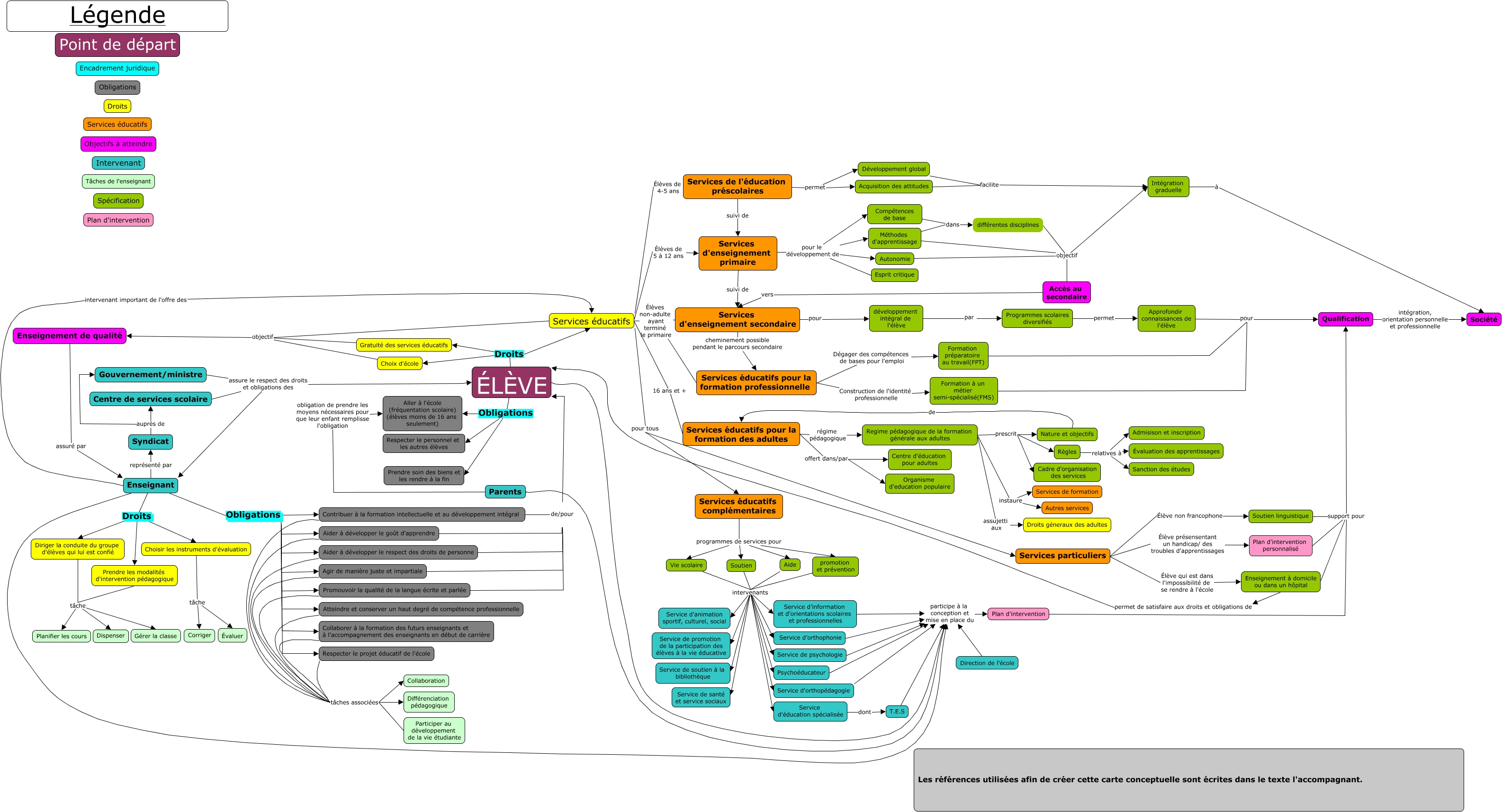 Cette carte de concepts créée avec IHMC CmapTools traite de: finaLe_Carte conceptuelle des services éducatifs_Équipe8, Qualification intégration, orientation personnelle et professionnelle Société, Aide intervenants Service d'orthopédagogie, Services d'enseignement primaire pour le développement de Compétences de base, Enseignant Obligations Contribuer à la formation intellectuelle et au développement intégral, Enseignant Droits Prendre les modalités d'intervention pédagogique, Règles relatives à Sanction des études, différentes disciplines objectif Intégration graduelle, Vie scolaire intervenants Psychoéducateur, Méthodes d'apprentissage dans différentes disciplines, Aide intervenants Service de soutien à la bibliothèque, Services d'enseignement primaire suivi de Services d'enseignement secondaire, promotion et prévention intervenants Service d'animation sportif, culturel, social, Service de psychologie participe à la conception et mise en place du Plan d'intervention, Aider à développer le goût d'apprendre de/pour ÉLÈVE, Vie scolaire intervenants Service de soutien à la bibliothèque, Promouvoir la qualité de la langue écrite et parlée tâches associées Participer au développement de la vie étudiante, Méthodes d'apprentissage objectif Intégration graduelle, Aider à développer le respect des droits de personne tâches associées Différenciation pédagogique, ÉLÈVE Obligations Prendre soin des biens et les rendre à la fin, Aide intervenants Service de promotion de la participation des élèves à la vie éducative