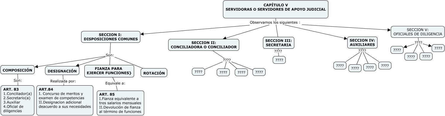 Este Cmap, tiene información relacionada con: Mapa conceptual, CAPÍTULO V SERVIDORAS O SERVIDORES DE APOYO JUDICIAL Observamos los siguientes : SECCION I: DISPOSICIONES COMUNES, SECCION IV: AUXILIARES ???? ????, SECCION I: DISPOSICIONES COMUNES Son: COMPOSICIÓN, DESIGNACIÓN Realizada por: ART.84 I. Concurso de meritos y examen de competencias II.Designacion adicional deacuerdo a sus necesidades, SECCION II: CONCILIADORA O CONCILIADOR ???? ????, CAPÍTULO V SERVIDORAS O SERVIDORES DE APOYO JUDICIAL Observamos los siguientes : SECCION V: OFICIALES DE DILIGENCIA, SECCION IV: AUXILIARES ???? ????, SECCION II: CONCILIADORA O CONCILIADOR ???? ????, SECCION IV: AUXILIARES ???? ????, SECCION IV: AUXILIARES ???? ????, CAPÍTULO V SERVIDORAS O SERVIDORES DE APOYO JUDICIAL Observamos los siguientes : SECCION II: CONCILIADORA O CONCILIADOR, SECCION II: CONCILIADORA O CONCILIADOR ???? ????, SECCION II: CONCILIADORA O CONCILIADOR ???? ????, SECCION III: SECRETARIA ???? ????, CAPÍTULO V SERVIDORAS O SERVIDORES DE APOYO JUDICIAL Observamos los siguientes : SECCION III: SECRETARIA, SECCION I: DISPOSICIONES COMUNES Son: DESIGNACIÓN, SECCION V: OFICIALES DE DILIGENCIA ???? ????, FIANZA PARA EJERCER FUNCIONES} Equivale a: ART. 85 I.Fianza equivalente a tres salarios mensuales II.Devolución de fianza al término de funciones, SECCION I: DISPOSICIONES COMUNES Son: FIANZA PARA EJERCER FUNCIONES}, SECCION I: DISPOSICIONES COMUNES Son: ROTACIÓN