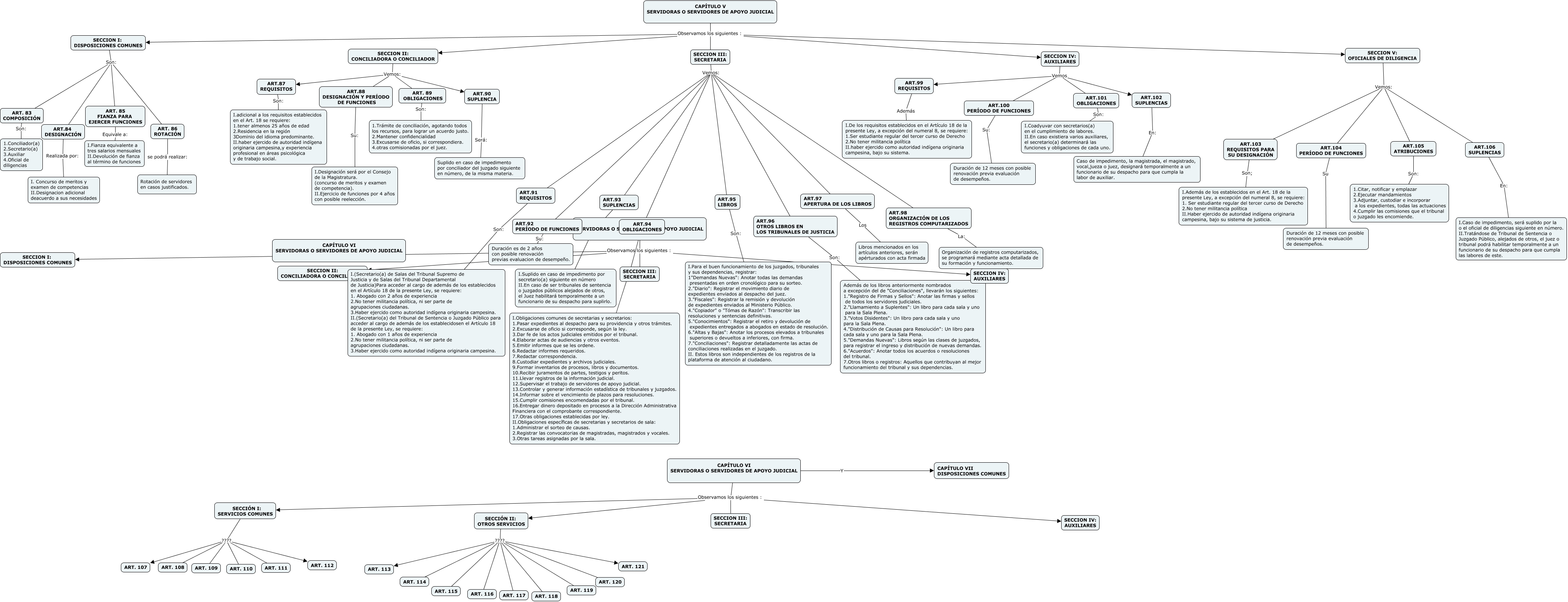 Este Cmap, tiene información relacionada con: Mapa conceptual, SECCION IV: AUXILIARES Vemos ART.102 SUPLENCIAS, CAPÍTULO V SERVIDORAS O SERVIDORES DE APOYO JUDICIAL Observamos los siguientes : SECCION II: CONCILIADORA O CONCILIADOR, SECCION V: OFICIALES DE DILIGENCIA Vemos: ART.104 PERÍODO DE FUNCIONES, ART.96 OTROS LIBROS EN LOS TRIBUNALES DE JUSTICIA Son: Además de los libros anteriormente nombrados a excepción del de "Conciliaciones", llevarán los siguientes: 1."Registro de Firmas y Sellos": Anotar las firmas y sellos de todos los servidores judiciales. 2."Llamamiento a Suplentes": Un libro para cada sala y uno para la Sala Plena. 3."Votos Disidentes": Un libro para cada sala y uno para la Sala Plena. 4."Distribución de Causas para Resolución": Un libro para cada sala y uno para la Sala Plena. 5."Demandas Nuevas": Libros según las clases de juzgados, para registrar el ingreso y distribución de nuevas demandas. 6."Acuerdos": Anotar todos los acuerdos o resoluciones del tribunal. 7.Otros libros o registros: Aquellos que contribuyan al mejor funcionamiento del tribunal y sus dependencias., CAPÍTULO V SERVIDORAS O SERVIDORES DE APOYO JUDICIAL Observamos los siguientes : SECCION III: SECRETARIA, SECCION III: SECRETARIA Vemos: ART.98 ORGANIZACIÓN DE LOS REGISTROS COMPUTARIZADOS, SECCIÓN II: OTROS SERVICIOS ???? ART. 114, CAPÍTULO V SERVIDORAS O SERVIDORES DE APOYO JUDICIAL Observamos los siguientes : SECCION III: SECRETARIA, SECCION V: OFICIALES DE DILIGENCIA Vemos: ART.105 ATRIBUCIONES, ART.97 APERTURA DE LOS LIBROS Los Libros mencionados en los artículos anteriores, serán apérturados con acta firmada, SECCION III: SECRETARIA Vemos: ART.95 LIBROS, SECCION V: OFICIALES DE DILIGENCIA Vemos: ART.106 SUPLENCIAS, SECCION III: SECRETARIA Vemos: ART.94 OBLIGACIONES, SECCIÓN II: OTROS SERVICIOS ???? ART. 116, CAPÍTULO VI SERVIDORAS O SERVIDORES DE APOYO JUDICIAL Observamos los siguientes : SECCIÓN I: SERVICIOS COMUNES, ART.105 ATRIBUCIONES Son: 1.Citar, notificar y emplazar 2.Ejecutar mandamientos 3.Adjuntar, custodiar e incorporar a los expedientes, todas las actuaciones 4.Cumplir las comisiones que el tribunal o juzgado les encomiende., ART. 85 FIANZA PARA EJERCER FUNCIONES Equivale a: I.Fianza equivalente a tres salarios mensuales II.Devolución de fianza al término de funciones, CAPÍTULO V SERVIDORAS O SERVIDORES DE APOYO JUDICIAL Observamos los siguientes : SECCION II: CONCILIADORA O CONCILIADOR, SECCION I: DISPOSICIONES COMUNES Son: ART. 85 FIANZA PARA EJERCER FUNCIONES, SECCION V: OFICIALES DE DILIGENCIA Vemos: ART.103 REQUISITOS PARA SU DESIGNACIÓN