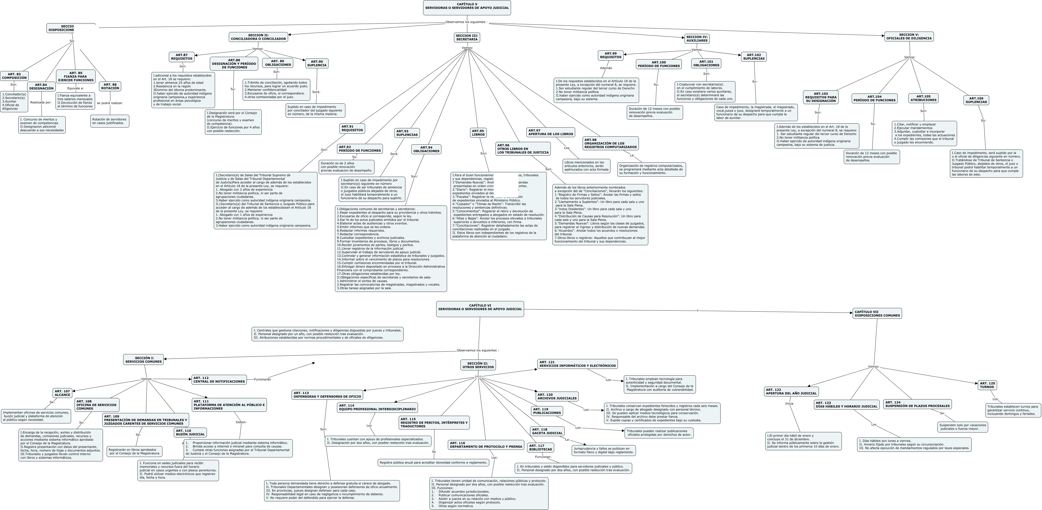 Este Cmap, tiene información relacionada con: Mapa conceptual 1, CAPÍTULO V SERVIDORAS O SERVIDORES DE APOYO JUDICIAL Observamos los siguientes : SECCION I: DISPOSICIONES COMUNES, ART. 108 OFICINA DE SERVICIOS COMUNES Se: I.Encarga de la recepción, sorteo y distribución de demandas, comisiones judiciales, recursos y acciones mediante sistema informático aprobado por el Consejo de la Magistratura. II.Registra presentación con datos del presentante, fecha, hora, número de fojas y documentos adjuntos. III.Tribunales y juzgados llevan control interno con libros y sistemas informáticos., SECCIÓN II: OTROS SERVICIOS ???? ART. 114 EQUIPO PROFESIONAL INTERDISCIPLINARIO, SECCION I: DISPOSICIONES COMUNES Son: ART. 86 ROTACIÓN, SECCIÓN II: OTROS SERVICIOS ???? ART. 120 ARCHIVOS JUDICIALES, ART. 116 DEPARTAMENTO DE PROTOCOLO Y PRENSA Los: I. Tribunales tienen unidad de comunicación, relaciones públicas y protocolo. II. Personal designado por dos años, con posible reelección tras evaluación. III. Funciones: 1. Difundir acuerdos jurisdiccionales. 2. Publicar comunicaciones oficiales. 3. Asistir a jueces en su relación con medios y público. 4. Organizar actos oficiales según protocolo. 5. Otras según normativa., CAPÍTULO V SERVIDORAS O SERVIDORES DE APOYO JUDICIAL Observamos los siguientes : SECCION V: OFICIALES DE DILIGENCIA, SECCIÓN I: SERVICIOS COMUNES Vemos: ART. 107 ALCANCE, SECCION II: CONCILIADORA O CONCILIADOR Vemos: ART.87 REQUISITOS, ART. 115 REGISTRO DE PERITOS, INTÉRPRETES Y TRADUCTORES Se Registra pública anual para acreditar idoneidad conforme a reglamento., SECCION III: SECRETARIA Vemos: ART.98 ORGANIZACIÓN DE LOS REGISTROS COMPUTARIZADOS, ART. 112 CENTRAL DE NOTIFICACIONES Funionarán I. Centrales que gestiona citaciones, notificaciones y diligencias dispuestas por jueces y tribunales. II. Personal designado por un año, con posible reelección tras evaluación. III. Atribuciones establecidas por normas procedimentales y de oficiales de diligencias., SECCION I: DISPOSICIONES COMUNES Son: ART. 83 COMPOSICIÓN, CAPÍTULO V SERVIDORAS O SERVIDORES DE APOYO JUDICIAL Observamos los siguientes : SECCION II: CONCILIADORA O CONCILIADOR, ART.102 SUPLENCIAS En: Caso de impedimento, la magistrada, el magistrado, vocal,jueza o juez, designará temporalmente a un funcionario de su despacho para que cumpla la labor de auxiliar., ART.94 OBLIGACIONES Son: I.Obligaciones comunes de secretarias y secretarios: 1.Pasar expedientes al despacho para su providencia y otros trámites. 2.Excusarse de oficio si corresponde, según la ley. 3.Dar fe de los actos judiciales emitidos por el tribunal. 4.Elaborar actas de audiencias y otros eventos. 5.Emitir informes que se les ordene. 6.Redactar informes requeridos. 7.Redactar correspondencia. 8.Custodiar expedientes y archivos judiciales. 9.Formar inventarios de procesos, libros y documentos. 10.Recibir juramentos de partes, testigos y peritos. 11.Llevar registros de la información judicial. 12.Supervisar el trabajo de servidores de apoyo judicial. 13.Controlar y generar información estadística de tribunales y juzgados. 14.Informar sobre el vencimiento de plazos para resoluciones. 15.Cumplir comisiones encomendadas por el tribunal. 16.Entregar dinero depositado en procesos a la Dirección Administrativa Financiera con el comprobante correspondiente. 17.Otras obligaciones establecidas por ley. II.Obligaciones específicas de secretarias y secretarios de sala: 1.Administrar el sorteo de causas. 2.Registrar las convocatorias de magistradas, magistrados y vocales. 3.Otras tareas asignadas por la sala., SECCION I: DISPOSICIONES COMUNES Son: ART.84 DESIGNACIÓN, SECCIÓN I: SERVICIOS COMUNES Vemos: ART. 109 PRESENTACIÓN DE DEMANDAS EN TRIBUNALES Y JUZGADOS CARENTES DE SERVICIOS COMUNES, CAPÍTULO VI SERVIDORAS O SERVIDORES DE APOYO JUDICIAL Observamos los siguientes : SECCIÓN II: OTROS SERVICIOS, ART. 123 DÍAS HÁBILES Y HORARIO JUDICIAL Los I. Días hábiles son lunes a viernes. II. Horario fijado por tribunales según su circunscripción. III. No afecta ejecución de mandamientos regulados por leyes especiales.