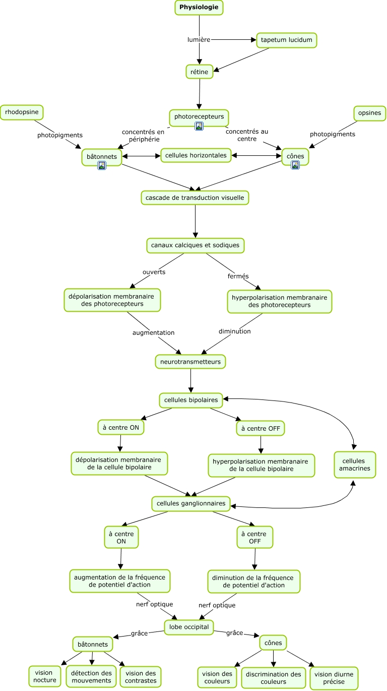Cette carte de concepts créée avec IHMC CmapTools traite de: Physiologie, tapetum lucidum rétine, cônes discrimination des couleurs, cellules bipolaires à centre ON, cellules bipolaires à centre OFF, hyperpolarisation membranaire des photorecepteurs diminution neurotransmetteurs, photorecepteurs concentrés au centre cônes, bâtonnets détection des mouvements, cascade de transduction visuelle canaux calciques et sodiques, Physiologie lumière rétine, cellules ganglionnaires à centre OFF, lobe occipital grâce cônes, cellules horizontales bâtonnets, bâtonnets vision des contrastes, cônes vision diurne précise, diminution de la fréquence de potentiel d'action nerf optique lobe occipital, canaux calciques et sodiques ouverts dépolarisation membranaire des photorecepteurs, opsines photopigments cônes, dépolarisation membranaire de la cellule bipolaire cellules ganglionnaires, bâtonnets vision nocture, à centre ON augmentation de la fréquence de potentiel d'action