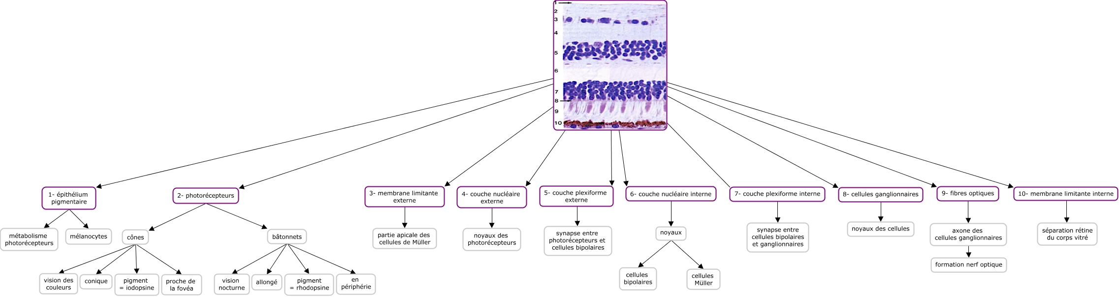 Cette carte de concepts créée avec IHMC CmapTools traite de: 10 couches, axone des cellules ganglionnaires formation nerf optique, 10- membrane limitante interne séparation rétine du corps vitré, 8- cellules ganglionnaires noyaux des cellules, bâtonnets allongé, 7- couche plexiforme interne synapse entre cellules bipolaires et ganglionnaires, bâtonnets pigment = rhodopsine, cônes pigment = iodopsine, cônes proche de la fovéa, 3- membrane limitante externe partie apicale des cellules de Müller, 10 couches cellulaires 2- photorécepteurs, 1- épithélium pigmentaire métabolisme photorécepteurs, 5- couche plexiforme externe synapse entre photorécepteurs et cellules bipolaires, 9- fibres optiques axone des cellules ganglionnaires, 10 couches cellulaires 6- couche nucléaire interne, 10 couches cellulaires 5- couche plexiforme externe, cônes vision des couleurs, 1- épithélium pigmentaire mélanocytes, 10 couches cellulaires 9- fibres optiques, 6- couche nucléaire interne noyaux, 4- couche nucléaire externe noyaux des photorécepteurs