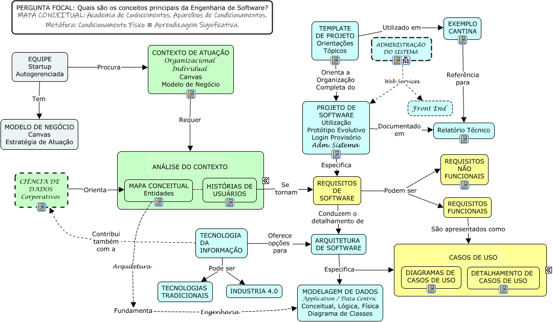 Esse mapa conceitual, produzido no IHMC CmapTools, tem a informação relacionada a: Exemplo2 para Orientação, REQUISITOS DE SOFTWARE Podem ser REQUISITOS NÃO FUNCIONAIS, TEMPLATE DE PROJETO Orientações Tópicos Orienta a Organização Completa do PROJETO DE SOFTWARE Utilização Protótipo Evolutivo Login Provisório Adm. Sistema, EQUIPE Startup Autogerenciada Tem MODELO DE NEGÓCIO Canvas Estratégia de Atuação, CIÊNCIA DE DADOS Corporativos Orienta MAPA CONCEITUAL Entidades, ADMINISTRAÇÃO DO SISTEMA Web Services Front End, TECNOLOGIA DA INFORMAÇÃO Pode ser INDUSTRIA 4.0, HISTÓRIAS DE USUÁRIOS Se tornam REQUISITOS DE SOFTWARE, TECNOLOGIA DA INFORMAÇÃO Contribui também com a CIÊNCIA DE DADOS Corporativos, ADMINISTRAÇÃO DO SISTEMA Web Services PROJETO DE SOFTWARE Utilização Protótipo Evolutivo Login Provisório Adm. Sistema, EXEMPLO CANTINA Referência para Relatório Técnico, TECNOLOGIA DA INFORMAÇÃO Oferece opções para ARQUITETURA DE SOFTWARE, REQUISITOS DE SOFTWARE Podem ser REQUISITOS FUNCIONAIS, MAPA CONCEITUAL Entidades Arquitetura Fundamenta Engenharia MODELAGEM DE DADOS Application / Data Centric Conceitual, Lógica, Física Diagrama de Classes, PROJETO DE SOFTWARE Utilização Protótipo Evolutivo Login Provisório Adm. Sistema Documentado em Relatório Técnico, REQUISITOS DE SOFTWARE Conduzem o detalhamento de ARQUITETURA DE SOFTWARE, PROJETO DE SOFTWARE Utilização Protótipo Evolutivo Login Provisório Adm. Sistema Especifica REQUISITOS DE SOFTWARE, ARQUITETURA DE SOFTWARE Especifica MODELAGEM DE DADOS Application / Data Centric Conceitual, Lógica, Física Diagrama de Classes, REQUISITOS FUNCIONAIS São apresentados como ????, CONTEXTO DE ATUAÇÃO Organizacional Individual Canvas Modelo de Negócio Requer ????, EQUIPE Startup Autogerenciada Procura CONTEXTO DE ATUAÇÃO Organizacional Individual Canvas Modelo de Negócio