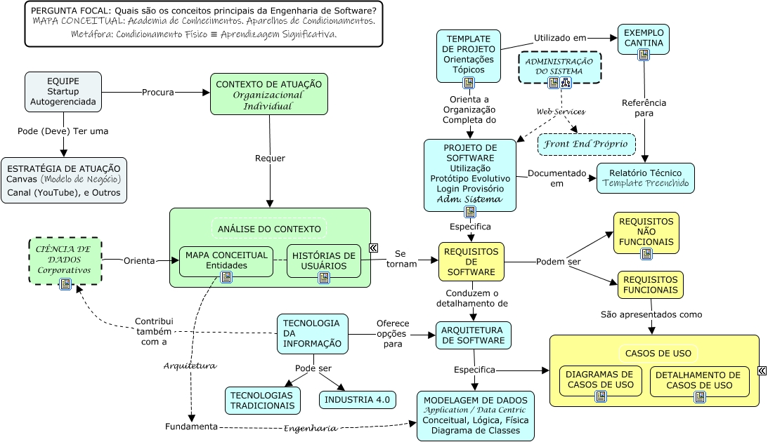 Esse mapa conceitual, produzido no IHMC CmapTools, tem a informação relacionada a: Exemplo para Orientação, REQUISITOS DE SOFTWARE Podem ser REQUISITOS NÃO FUNCIONAIS, TEMPLATE DE PROJETO Orientações Tópicos Orienta a Organização Completa do PROJETO DE SOFTWARE Utilização Protótipo Evolutivo Login Provisório Adm. Sistema, EQUIPE Startup Autogerenciada Pode (Deve) Ter uma ESTRATÉGIA DE ATUAÇÃO Canvas (Modelo de Negócio) Canal (YouTube), e Outros, CIÊNCIA DE DADOS Corporativos Orienta MAPA CONCEITUAL Entidades, ADMINISTRAÇÃO DO SISTEMA Web Services Front End Próprio, TECNOLOGIA DA INFORMAÇÃO Pode ser INDUSTRIA 4.0, HISTÓRIAS DE USUÁRIOS Se tornam REQUISITOS DE SOFTWARE, TECNOLOGIA DA INFORMAÇÃO Contribui também com a CIÊNCIA DE DADOS Corporativos, ADMINISTRAÇÃO DO SISTEMA Web Services PROJETO DE SOFTWARE Utilização Protótipo Evolutivo Login Provisório Adm. Sistema, EXEMPLO CANTINA Referência para Relatório Técnico Template Preenchido, TECNOLOGIA DA INFORMAÇÃO Oferece opções para ARQUITETURA DE SOFTWARE, REQUISITOS DE SOFTWARE Podem ser REQUISITOS FUNCIONAIS, MAPA CONCEITUAL Entidades Arquitetura Fundamenta Engenharia MODELAGEM DE DADOS Application / Data Centric Conceitual, Lógica, Física Diagrama de Classes, PROJETO DE SOFTWARE Utilização Protótipo Evolutivo Login Provisório Adm. Sistema Documentado em Relatório Técnico Template Preenchido, REQUISITOS DE SOFTWARE Conduzem o detalhamento de ARQUITETURA DE SOFTWARE, PROJETO DE SOFTWARE Utilização Protótipo Evolutivo Login Provisório Adm. Sistema Especifica REQUISITOS DE SOFTWARE, ARQUITETURA DE SOFTWARE Especifica MODELAGEM DE DADOS Application / Data Centric Conceitual, Lógica, Física Diagrama de Classes, REQUISITOS FUNCIONAIS São apresentados como ????, CONTEXTO DE ATUAÇÃO Organizacional Individual Requer ????, EQUIPE Startup Autogerenciada Procura CONTEXTO DE ATUAÇÃO Organizacional Individual