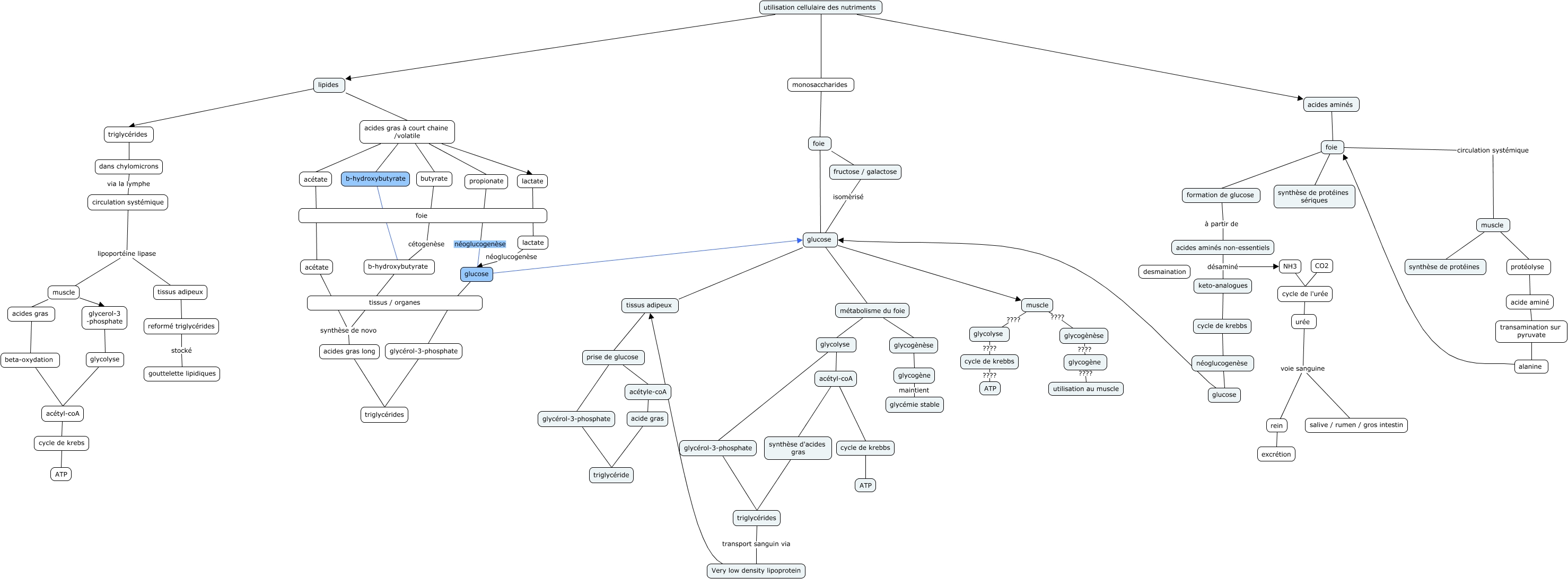 Cette carte de concepts créée avec IHMC CmapTools traite de: LVETE1381 utilisation cellulaire, cycle de krebs ATP, cycle de krebbs ATP, glycogène ???? utilisation au muscle, protéolyse acide aminé, cycle de l'urée urée, glucose glucose, glycolyse ???? cycle de krebbs, transamination sur pyruvate alanine, foie formation de glucose, alanine foie, lactate lactate, monosaccharides foie, prise de glucose acétyle-coA, acides gras à court chaine /volatile butyrate, cycle de krebbs ???? ATP, acétyl-coA cycle de krebbs, CO2 cycle de l'urée, acides gras à court chaine /volatile propionate, utilisation cellulaire des nutriments acides aminés, rein excrétion