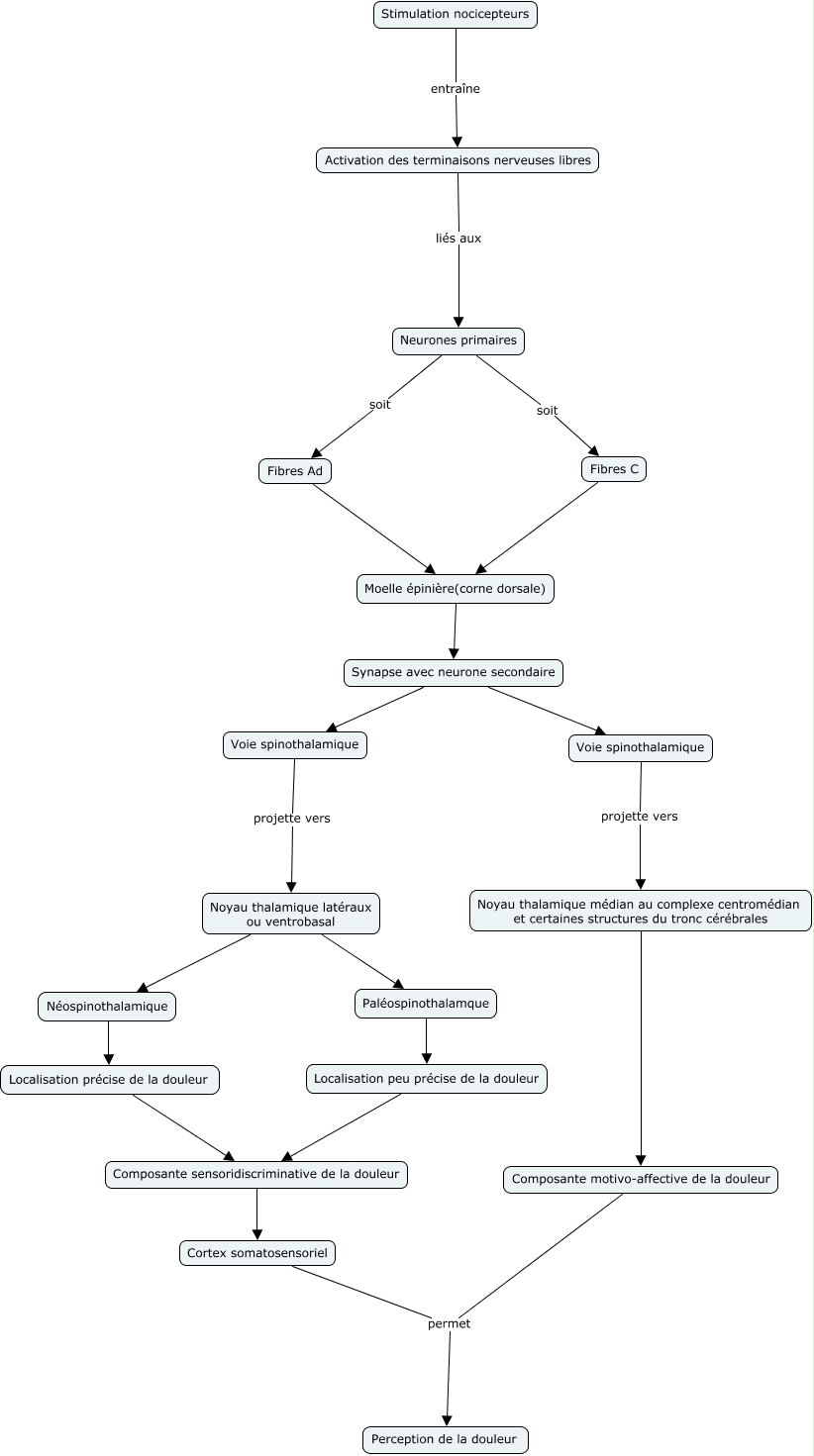 Cette carte de concepts créée avec IHMC CmapTools traite de: traitement nociceptif sophistiqué, Localisation peu précise de la douleur Composante sensoridiscriminative de la douleur, Synapse avec neurone secondaire Voie spinothalamique, Activation des terminaisons nerveuses libres liés aux Neurones primaires, Composante sensoridiscriminative de la douleur Cortex somatosensoriel, Moelle épinière(corne dorsale) Synapse avec neurone secondaire, Localisation précise de la douleur Composante sensoridiscriminative de la douleur, Fibres Ad Moelle épinière(corne dorsale), Fibres C Moelle épinière(corne dorsale), Noyau thalamique latéraux ou ventrobasal Néospinothalamique, Neurones primaires soit Fibres Ad, Noyau thalamique médian au complexe centromédian et certaines structures du tronc cérébrales Composante motivo-affective de la douleur, Synapse avec neurone secondaire Voie spinothalamique, Néospinothalamique Localisation précise de la douleur, Cortex somatosensoriel permet Perception de la douleur, Stimulation nocicepteurs entraîne Activation des terminaisons nerveuses libres, Voie spinothalamique projette vers Noyau thalamique médian au complexe centromédian et certaines structures du tronc cérébrales, Voie spinothalamique projette vers Noyau thalamique latéraux ou ventrobasal, Composante motivo-affective de la douleur permet Perception de la douleur, Paléospinothalamque Localisation peu précise de la douleur, Neurones primaires soit Fibres C