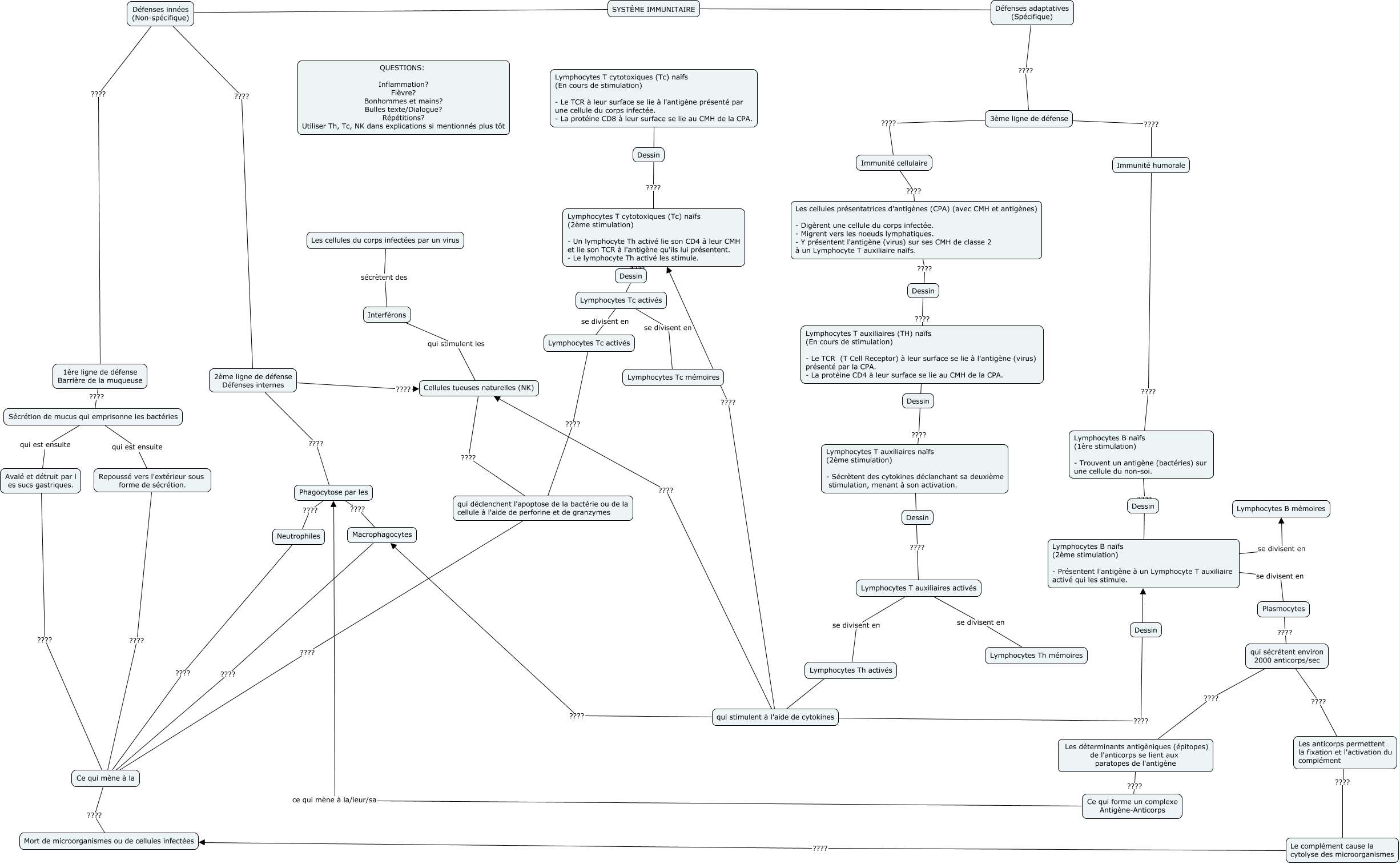 Cette carte de concepts créée avec IHMC CmapTools traite de: Système Immunitaire, Dessin ???? Lymphocytes T auxiliaires (TH) naïfs (En cours de stimulation) - Le TCR (T Cell Receptor) à leur surface se lie à l'antigène (virus) présenté par la CPA. - La protéine CD4 à leur surface se lie au CMH de la CPA., Défenses innées (Non-spécifique) ???? 2ème ligne de défense Défenses internes, qui sécrétent environ 2000 anticorps/sec ???? Les déterminants antigèniques (épitopes) de l'anticorps se lient aux paratopes de l'antigène, Lymphocytes Tc activés se divisent en Lymphocytes Tc activés, qui sécrétent environ 2000 anticorps/sec ???? Les anticorps permettent la fixation et l'activation du complément, Les déterminants antigèniques (épitopes) de l'anticorps se lient aux paratopes de l'antigène ???? Ce qui forme un complexe Antigène-Anticorps, 3ème ligne de défense ???? Immunité cellulaire, Lymphocytes B naïfs (2ème stimulation) - Présentent l'antigène à un Lymphocyte T auxiliaire activé qui les stimule. se divisent en Lymphocytes B mémoires, Lymphocytes T auxiliaires (TH) naïfs (En cours de stimulation) - Le TCR (T Cell Receptor) à leur surface se lie à l'antigène (virus) présenté par la CPA. - La protéine CD4 à leur surface se lie au CMH de la CPA. ???? Lymphocytes T auxiliaires naïfs (2ème stimulation) - Sécrètent des cytokines déclanchant sa deuxième stimulation, menant à son activation., Immunité humorale ???? Lymphocytes B naïfs (1ère stimulation) - Trouvent un antigène (bactéries) sur une cellule du non-soi., Sécrétion de mucus qui emprisonne les bactéries qui est ensuite Repoussé vers l'extérieur sous forme de sécrétion., SYSTÈME IMMUNITAIRE ???? Défenses adaptatives (Spécifique), SYSTÈME IMMUNITAIRE ???? Défenses innées (Non-spécifique), Lymphocytes B naïfs (2ème stimulation) - Présentent l'antigène à un Lymphocyte T auxiliaire activé qui les stimule. se divisent en Plasmocytes, 1ère ligne de défense Barrière de la muqueuse ???? Sécrétion de mucus qui emprisonne les bactéries, Lymphocytes Tc activés se divisent en Lymphocytes Tc mémoires, Interférons qui stimulent les Cellules tueuses naturelles (NK), Les cellules du corps infectées par un virus sécrètent des Interférons, qui stimulent à l'aide de cytokines ???? Lymphocytes B naïfs (2ème stimulation) - Présentent l'antigène à un Lymphocyte T auxiliaire activé qui les stimule., Lymphocytes T auxiliaires activés se divisent en Lymphocytes Th activés