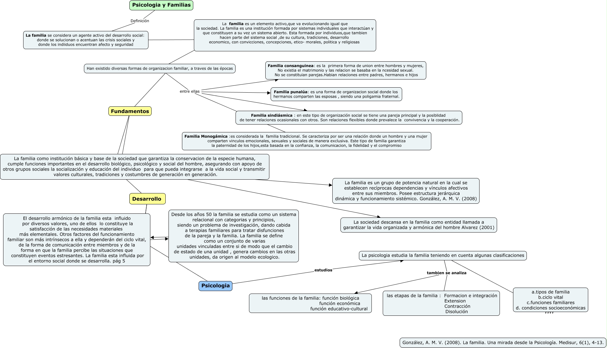 Este Cmap, tiene información relacionada con: Modelos, Han existido diversas formas de organizacion familiar, a traves de las épocas entre ellas Familia Monogámica :es considerada la familia tradicional. Se caracteriza por ser una relación donde un hombre y una mujer comparten vinculos emocionales, sexuales y sociales de manera exclusiva. Este tipo de familia garantiza la paternidad de los hijos,esta basada en la confianza, la comunicacion, la fidelidad y el compromiso, Psicologia y Familias Definición La familia se considera un agente activo del desarrollo social: donde se solucionan o acentuan las crisis sociales y donde los indiiduos encuentran afecto y seguridad, Han existido diversas formas de organizacion familiar, a traves de las épocas entre ellas Familia sindiásmica : en este tipo de organización social se tiene una pareja principal y la posiblidad de tener relaciones ocasionales con otros. Son relaciones flexibles donde prevalece la convivencia y la cooperación., Han existido diversas formas de organizacion familiar, a traves de las épocas la Fundamentos, Fundamentos ???? La familia como institución básica y base de la sociedad que garantiza la conservacion de la especie humana, cumple funciones importantes en el desarrollo biológico, psicológico y social del hombre, asegurando con apoyo de otros grupos sociales la socialización y educación del individuo para que pueda integrarse a la vida social y transmitir valores culturales, tradiciones y costumbres de generación en generación., Desde los años 50 la familia se estudia como un sistema relacional con categorias y principios, siendo un problema de investigación, dando cabida a terapias familiares para tratar disfunciones de la pareja y la familia. La familia se define como un conjunto de varias unidades vinculadas entre si de modo que el cambio de estado de una unidad , genera cambios en las otras unidades, da origen al modelo ecologico. ???? El desarrollo armónico de la familia esta influido por diversos valores, uno de ellos lo constituye la satisfacción de las necesidades materiales más elementales. Otros factores del funcionamiento familiar son más intrínsecos a ella y dependerán del ciclo vital, de la forma de comunicación entre miembros y de la forma en que la familia percibe las situaciones que constituyen eventos estresantes. La familia esta influida por el entorno social donde se desarrolla. pág 5, Han existido diversas formas de organizacion familiar, a traves de las épocas entre ellas Familia consanguinea: es la primera forma de union entre hombres y mujeres, No existia el matrimonio y las relacion se basaba en la ncesidad sexual. No se constituian parejas.Habian relaciones entre padres, hermanos e hijos, La familia como institución básica y base de la sociedad que garantiza la conservacion de la especie humana, cumple funciones importantes en el desarrollo biológico, psicológico y social del hombre, asegurando con apoyo de otros grupos sociales la socialización y educación del individuo para que pueda integrarse a la vida social y transmitir valores culturales, tradiciones y costumbres de generación en generación. ???? La sociedad descansa en la familia como entidad llamada a garantizar la vida organizada y armónica del hombre Alvarez (2001), Desarrollo ???? Desde los años 50 la familia se estudia como un sistema relacional con categorias y principios, siendo un problema de investigación, dando cabida a terapias familiares para tratar disfunciones de la pareja y la familia. La familia se define como un conjunto de varias unidades vinculadas entre si de modo que el cambio de estado de una unidad , genera cambios en las otras unidades, da origen al modelo ecologico., Han existido diversas formas de organizacion familiar, a traves de las épocas entre ellas Familia punalúa: es una forma de organizacion social donde los hermanos comparten las esposas , siendo una poligamia fraternal., Desarrollo ???? Psicologia, Psicologia estudios La psicologia estudia la familia teniendo en cuenta algunas clasificaciones, La psicologia estudia la familia teniendo en cuenta algunas clasificaciones ???? a.tipos de familia b.ciclo vital c.funciones familiares d. condiciones socioeconómicas, La psicologia estudia la familia teniendo en cuenta algunas clasificaciones tambien se analiza las funciones de la familia: función biológica función económica función educativo-cultural, La familia se considera un agente activo del desarrollo social: donde se solucionan o acentuan las crisis sociales y donde los indiiduos encuentran afecto y seguridad ???? La familia es un elemento activo,que va evolucionando igual que la sociedad. La familia es una institución formada por sistemas individuales que interactúan y que constituyen a su vez un sistema abierto. Esta formada por individuos,que tambien hacen parte del sistema social ,de su cultura, tradiciones, desarrollo economico, con convicciones, concepciones, etico- morales, politica y religiosas, La psicologia estudia la familia teniendo en cuenta algunas clasificaciones tambien se analiza las etapas de la familia : Formacion e integración Extension Contracción Disolución, La familia como institución básica y base de la sociedad que garantiza la conservacion de la especie humana, cumple funciones importantes en el desarrollo biológico, psicológico y social del hombre, asegurando con apoyo de otros grupos sociales la socialización y educación del individuo para que pueda integrarse a la vida social y transmitir valores culturales, tradiciones y costumbres de generación en generación. ???? La familia es un grupo de potencia natural en la cual se establecen recíprocas dependencias y vínculos afectivos entre sus miembros. Posee estructura jerárquica dinámica y funcionamiento sistémico. González, A. M. V. (2008), La familia es un elemento activo,que va evolucionando igual que la sociedad. La familia es una institución formada por sistemas 