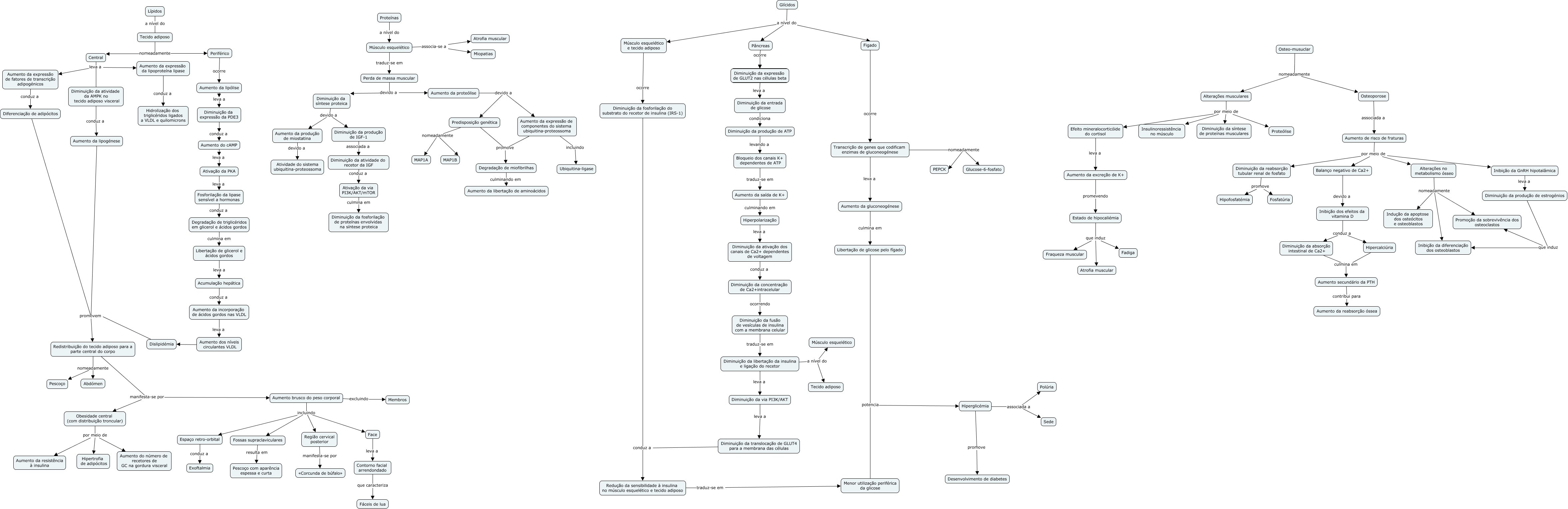 Esse mapa conceitual, produzido no IHMC CmapTools, tem a informação relacionada a: PARTE DA LAURINHA, Diminuição da ativação dos canais de Ca2+ dependentes de voltagem conduz a Diminuição da concentração de Ca2+intracelular, Alterações musculares por meio de Insulinoressistência no músculo, Pâncreas ocorre Diminuição da expressão de GLUT2 nas células beta, Diminuição da entrada de glicose condiciona Diminuição da produção de ATP, Aumento da expressão da lipoproteína lipase conduz a Hidrolização dos triglicéridos ligados a VLDL e quilomicrons, Efeito mineralocorticóide do cortisol leva a Aumento da excreção de K+, Hiperpolarização leva a Diminuição da ativação dos canais de Ca2+ dependentes de voltagem, Aumento brusco do peso corporal incluindo Face, Figado ocorre Transcrição de genes que codificam enzimas de gluconeogénese, Aumento de risco de fraturas por meio de Balanço negativo de Ca2+, Hiperglicémia associada a Sede, Aumento da expressão de componentes do sistema ubiquitina-proteossoma promove Degradação de miofibrilhas, Redução da sensibilidade à insulina no músculo esquelético e tecido adiposo traduz-se em Menor utilização periférica da glicose, Periférico ocorre Aumento da lipólise, Aumento da gluconeogénese culmina em Libertação de glicose pelo fígado, Acumulação hepática conduz a Aumento da incorporação de ácidos gordos nas VLDL, Estado de hipocaliémia que induz Fraqueza muscular, Perda de massa muscular devido a Aumento da proteólise, Diminuição da libertação da insulina e ligação do recetor a nível do Músculo esquelético, Proteínas a nível do Músculo esquelético