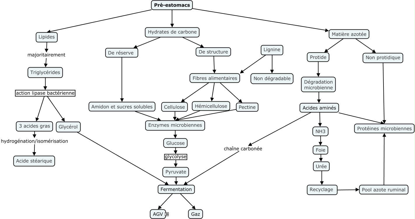 Cette carte de concepts créée avec IHMC CmapTools traite de: Carte pré-estomacs définitif, Utilisation Propionate, Fibres alimentaires Hémicellulose, Urée Recyclage, Enzymes microbiennes Glucose, Hémicellulose Enzymes microbiennes, Pré-estomacs Lipides, B-hydroxybutyrate Acides gras, Glycérol Fermentation, Protide Dégradation microbienne, Matière azotée Protide, Triglycérides action lipase bactérienne 3 acides gras, Fibres alimentaires Cellulose, Lignine Fibres alimentaires, Acides aminés Protéines microbiennes, Matière azotée Non protidique, Fibres alimentaires Pectine, Fermentation AGV, Acétate Acides gras, Utilisation Acétate, Pyruvate Fermentation