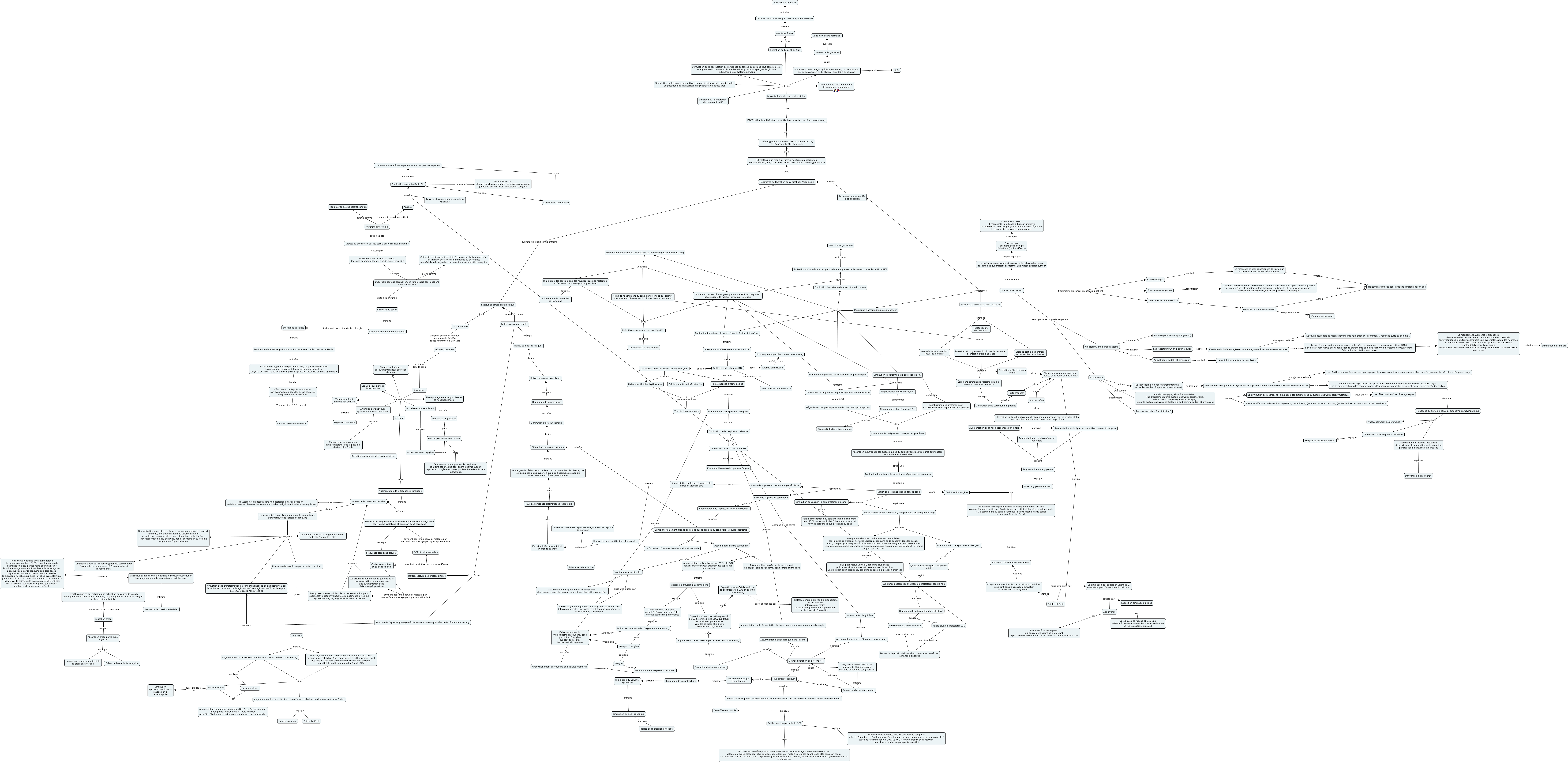 Cette carte de concepts créée avec IHMC CmapTools traite de: Biologie 5, Adrénaline qui agit sur Tube digestif qui diminue son activité, Étirement constant de l'estomac dû à la présence constante du chyme entraîne Diminution de la sécrétion de ghréline, Augmentation des ions H+ et K+ dans l'urine et diminution des ions Na+ dans l'urine explique Baisse kaliémie, La vasocontriction et l'augmentation de la résistance périphérique des vaisseaux sanguins entraîne Hausse de la pression artérielle, Plus petit pH sanguin entraîne Hausse de la fréquence respiratoire pour se débarasser du CO2 et diminuer la formation d'acide carbonique, Les artérioles périphériques qui font de la vasoconstriction ce qui provoque une augmentation de la résistance périphérique provoque Hausse de la pression artérielle, Dépôts de cholestérol sur les parois des vaisseaux sanguins causée par Obstruction des artères du coeur, donc une augmentation de la résistance vasculaire, Quantité d'acides gras transportés au foie réduit Substance nécessaires synthèse du cholestérol dans le foie, Cancer de l'estomac symptômes Anxiété à long terme liée à sa condition, Diminution importante de la sécrétion de HCl entraine Diminution de la quantité de pepsinogène activé en pepsine, Cancer de l'estomac symptômes Muqueuse n'accomplit plus ses fonctions, Faible taux de cholestérol LDL aussi expliqué par Baisse de l'apport nutritionnel en cholestérol causé par le manque d'appétit, Diminution des sécrétions gastrique dont le HCl (en majorité), pepsinogène, le facteur intrisèque, le mucus donc Ralentissement des processus digestifs, Détection de la faible glycémie et sécrétion du glucagon par les cellules alpha du pancréas pour contrer la baisse de la glycémie entraîne Augmentation de la glycogénolyse par le foie, Foie qui augmente sa glycolyse et sa néoglucogénèse entraîne Hausse de la glycémie, Sortie anormalement grande de liquide qui se déplace du sang vers le liquide interstitiel cause Oedème dans l'arbre pulmonaire, Activation de la transformation de l'angiotensinogène en angiotensine I par la rénine et conversion de l'angiotensine I en angiotensine II par l'enzyme de conversion de l'angiotensine entraîne Libération d'ADH par la neurohypophyse stimulée par l'hypothalamus qui a détecté l'angiotensine et l'hypovolémie, Les récepteurs GABA à courte durée excite L'activité du GABA en agissant comme agoniste à ces neurotransmetteurs, Le cortisol stimule les cellules cibles. entraine Stimulation de la néoglucogénèse par le foie, soit l'utilisation des acides aminés et du glycérol pour faire du glucose, Augmentation du pH du chyme compromet Élimination les bactéries ingérées