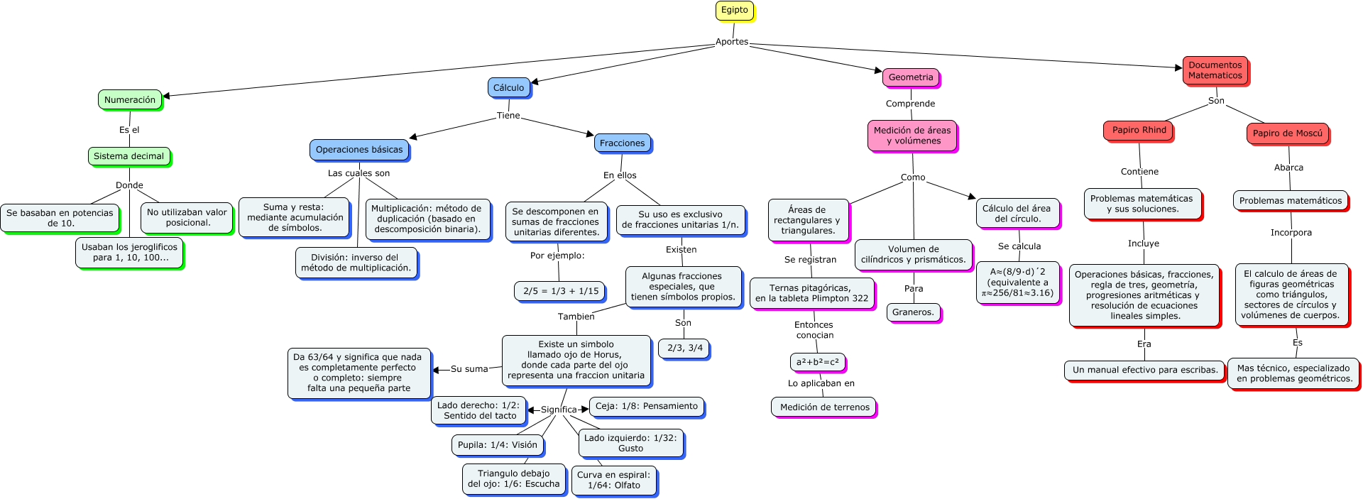 Este Cmap, tiene información relacionada con: Egipto, El calculo de áreas de figuras geométricas como triángulos, sectores de círculos y volúmenes de cuerpos. Es Mas técnico, especializado en problemas geométricos., Fracciones En ellos <math xmlns="http://www.w3.org/1998/Math/MathML"> <mrow> <mtext> Su uso es exclusivo